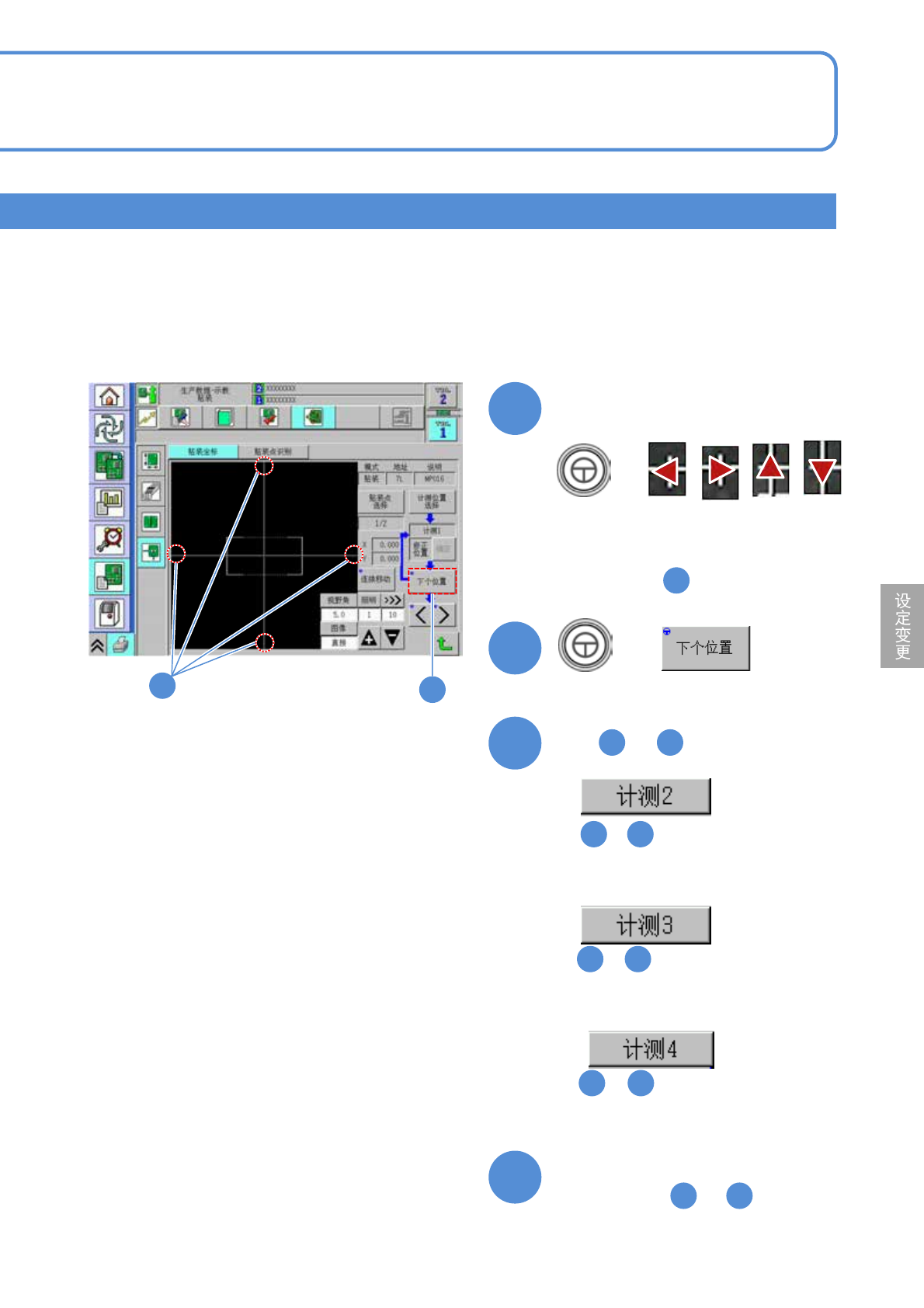 NPM-D3 EJM6DC-MB-06O-0 9 生产数据 校正 贴装坐标校正 8 操作篇 6-2-9 6-2-9 -15 通过元件进行校正 ( 计测方法 : 4 点 ) 1 2 3 + 、 、 4 ■基板上有贴装元件时 ■基板上没有贴装元件时 5 7 至 至 、 5 + ●使十字线对准元件的上端。 使十字线对准元件端面 ●参阅「通过元件进行校正 ( 计测方法 : 2 点 ) 」的顺序 。 6 5 6 5 ● 都需要进行。 2 3 进行…