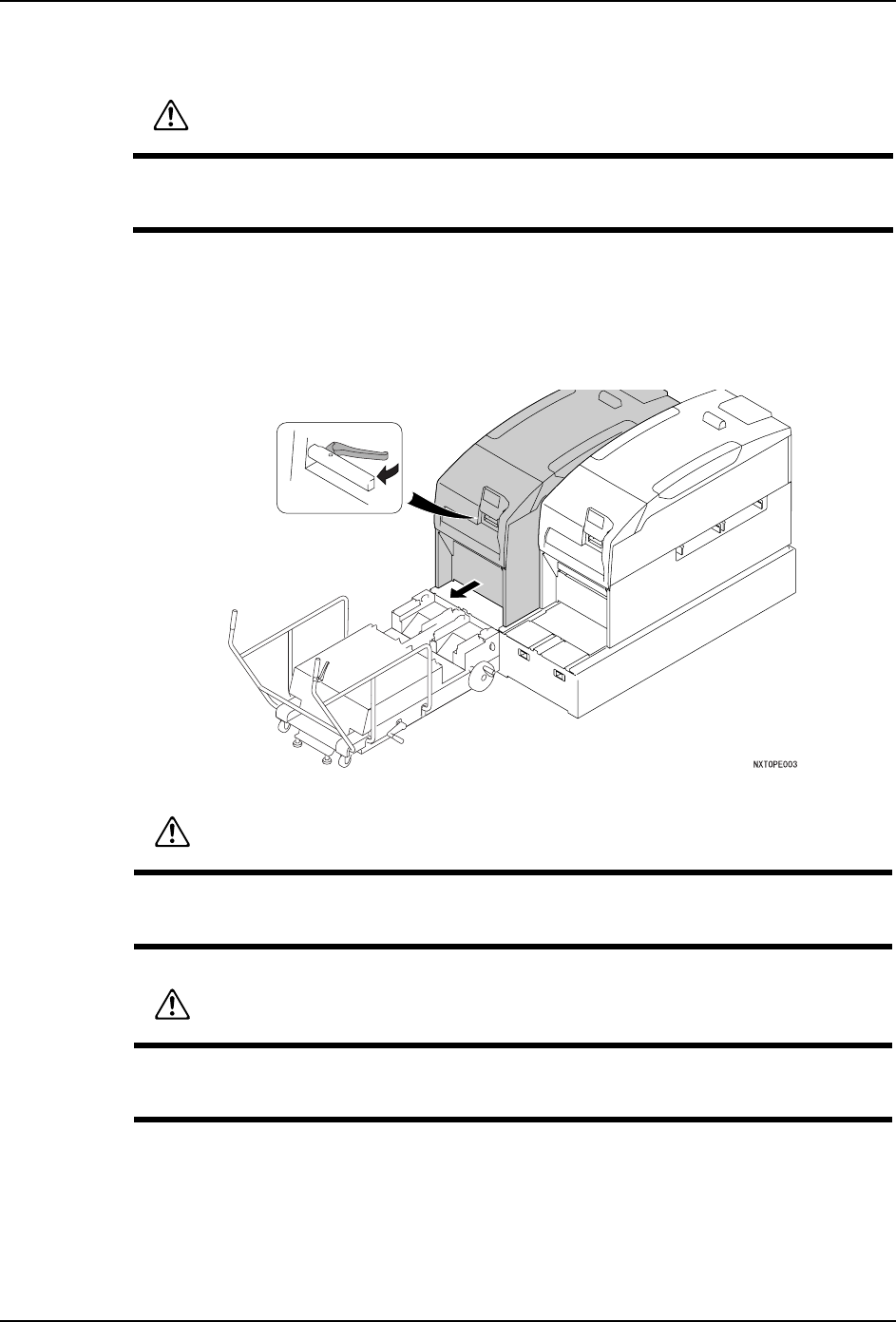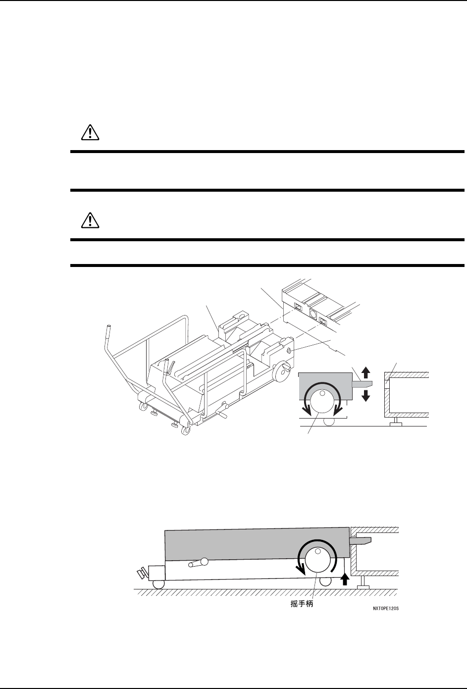 5. 基本操作 QD145-11 94 NXT II 机械手册 b. 同样地旋转摇手柄,提升后轮 ( 使升降脚接触地面 )。一边看水平仪,一边尽 可能使 MCU 的上面调节成 为水平状态。 6. 将模组从基座中里拉出一半 a. 将 MCU 的 旋纽旋转到 "UNLOCK"。 备注 )MCU 与基座没有正确地连接时,不能旋转 MCU 的旋钮。 b. 按下操作面板的 「MANUAL」按 钮,可以切换到手动操作画面。 c.…