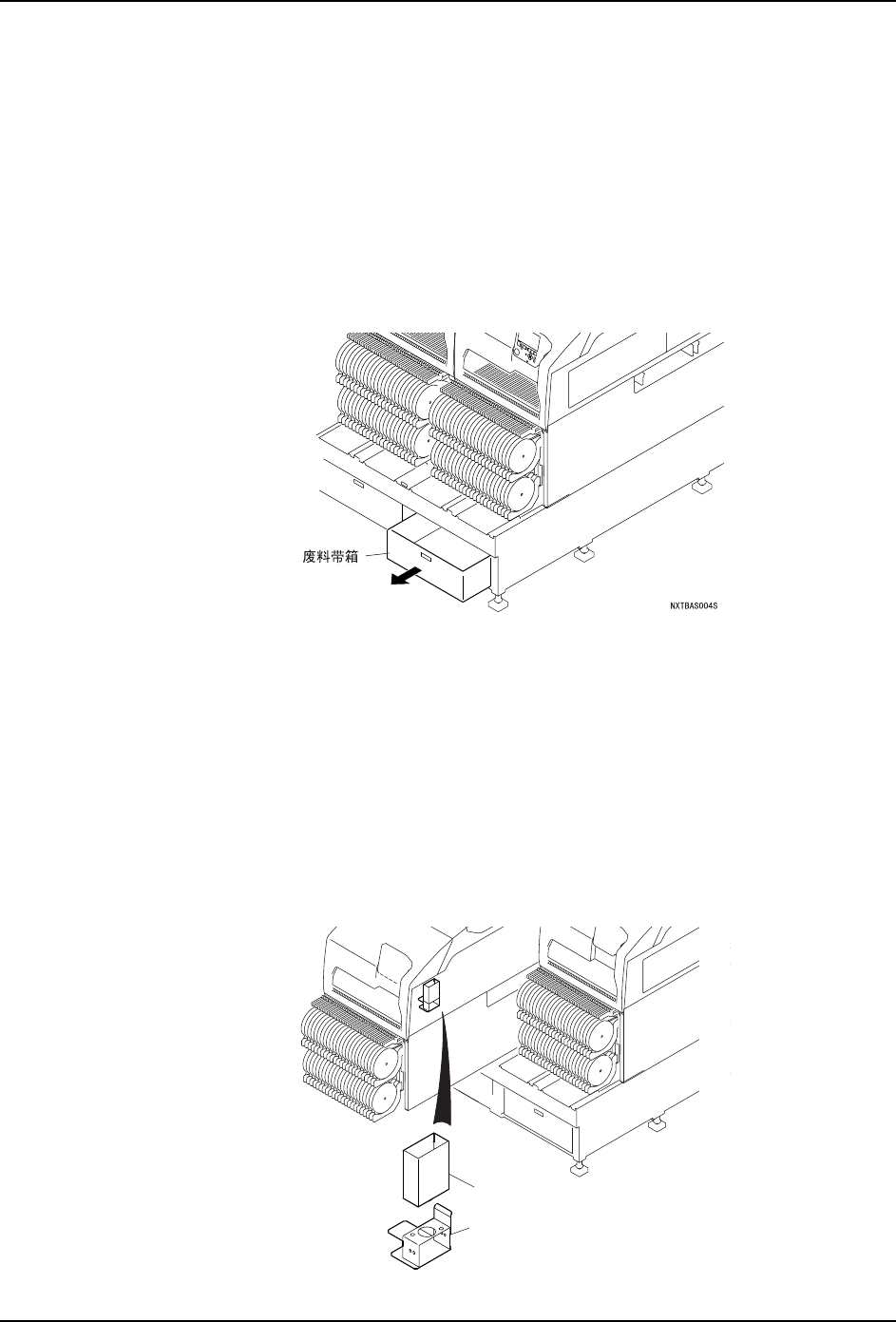 请进行料站托架用或者料盘单元 -LT/LTC 用的废料带箱内的清扫 .