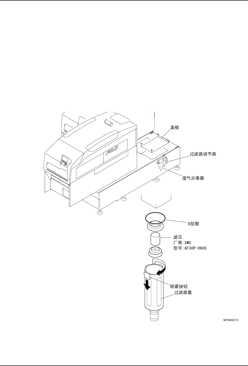 QD145-11 6. 预防保养 NXT II 机械手册 243 6.8.8 清扫刷单元置放台类型过滤器的清扫 1. 请拉出模组。( 参照 「5.1 模组的拉出 / 插入」 。) 2. 请取下模组左侧面的开口内部的过滤器 。 备注 )下列插图是 M6-2 模组 , 不过,关于 M3-2 模组在同样的位置上也安装了过滤器。 3. 请从过滤器上取下空气管。 4. 请旋转滤器取出过滤器滤芯。 5. 请使用气枪,除去过滤器滤芯附着的异物。污垢厉…
