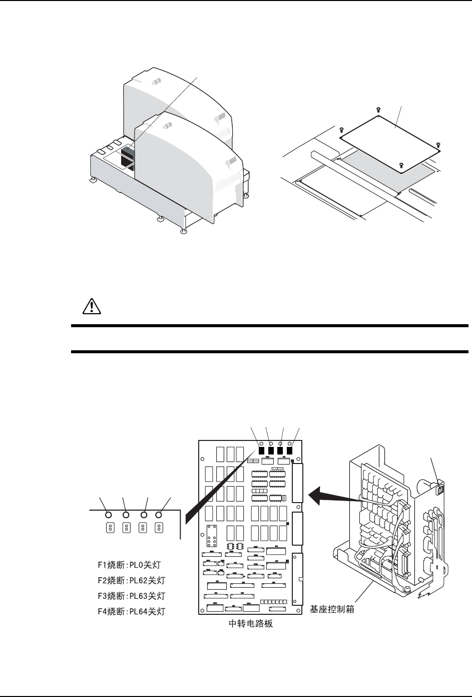 4. 请从基座控制箱的中转电路板拔下保险丝 (F1, F2, F3, F4) 进行更换,基座控制箱的