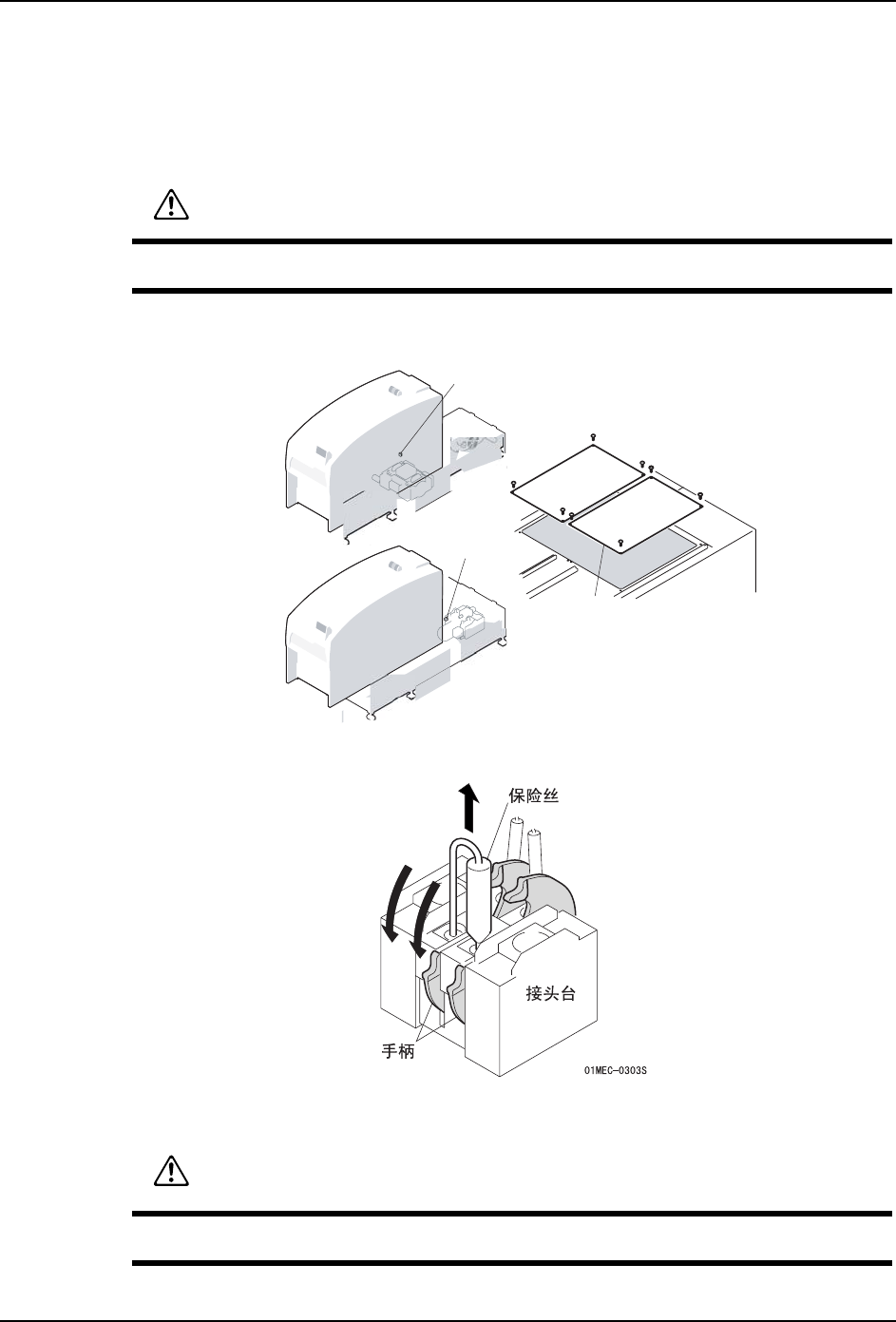 3. 对于中转电路板内的保险丝,在确认烧断的保险丝是哪一根后,将主电源开关 OFF。