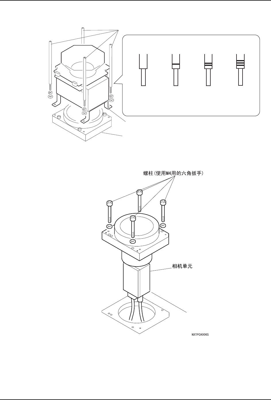 8. 部件的更换 QD145-11 406 NXT II 机械手册 8. 从相机后部拆下连接线插头 (2 个 )。 9. 按照与取下时相反的顺序安装新的单元。 注意 )在安装灯具单元时,请注意双头螺栓不要咬住连接线。否则连接线有可能短路。 10.安装相机单元到模组上 的时候,请注意以下几点。 a. 相机的安装方向为使相机单元的切口朝向 搬运轨道侧。 b . 将 基 座 上 的 定 位 销 与 相 机 单 元(反 面)的U字 漕 对 齐 …