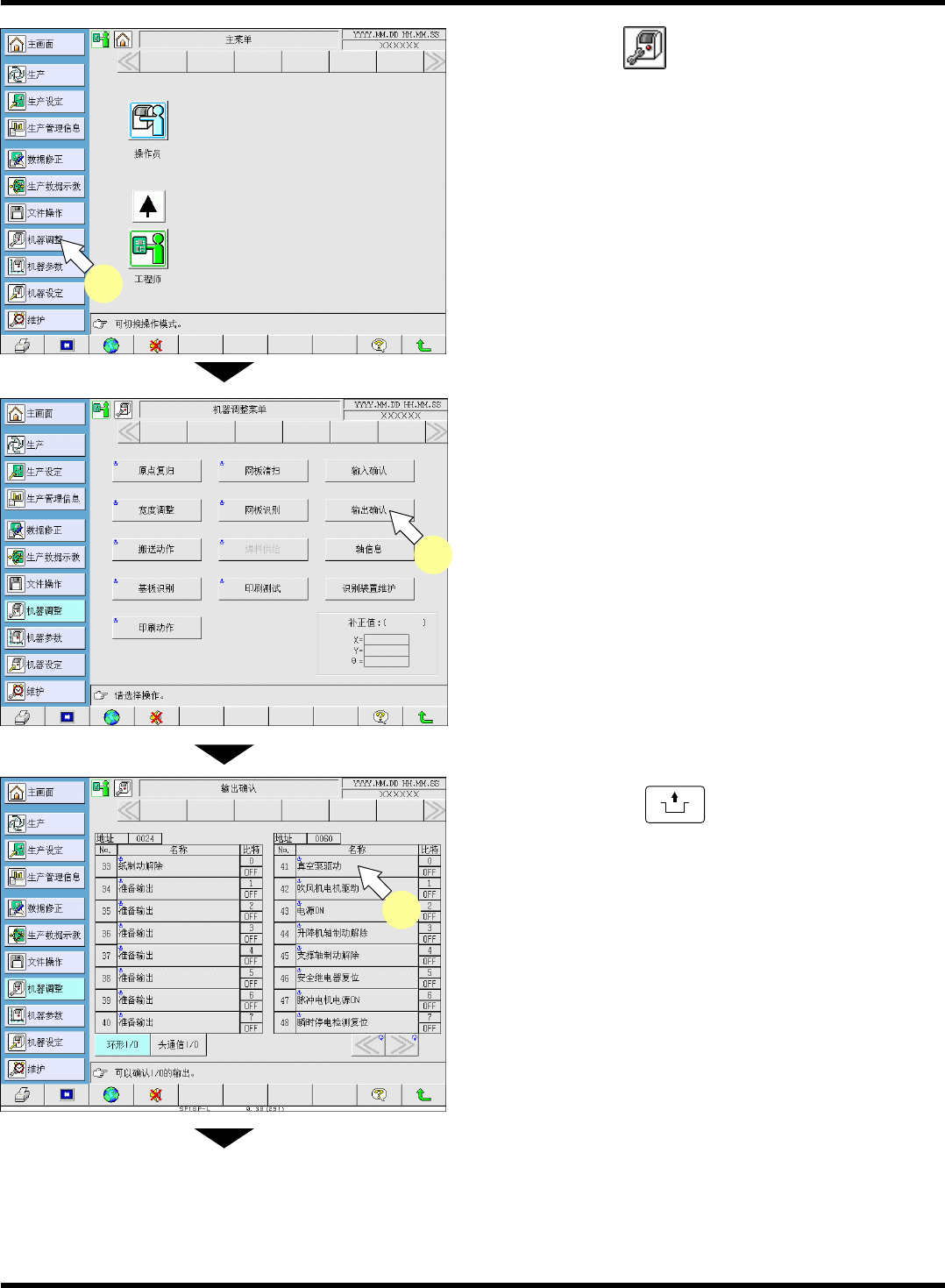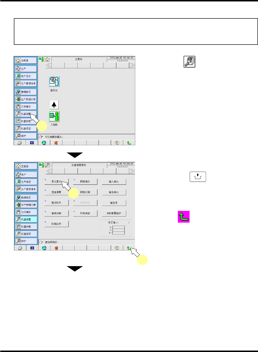 SP18P-L 维修手册 3.1 各种传感器的动作确认 Page 3-7 1. 设定值输入 通知 在进行设定值输入之前,请安装基板吸着盒。 所使用的基板为实际生产基板,请不要使用弯曲的基板。 1. 按主菜单的 。 • 将显示 < 机器调整菜单 > 画面。 2. 按操作面板的 UNLOCK + [ 原点复归 ] 。 ∗ 真空传感器的显示部安装在 XY 工作台的右下 部,将 XY 工作台返回到原点位置。 3. 按功能键 。 • …