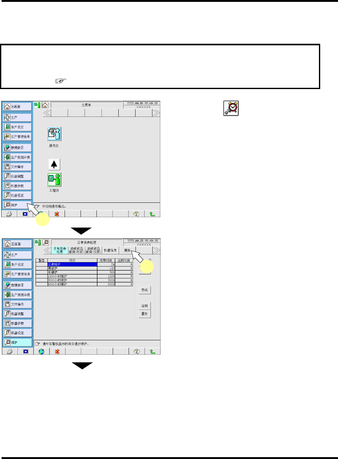 SP18P-L 维修手册 3.2 系统版本的更新 Pa ge 3- 18 3.2.3 机器系统软件的更新 从 SD 卡安装机器系统 软件。请事先插入已安装好 系统的 SD 卡。 要求 在进行系统更新后,有时会出现存储在装置中的生产数据被删除的情况。因此,在进 行系统更新之前,请将现在使用的生产数据存储到 SD 卡 ( 或者硬盘 ) 中。 ( 保存方法 程序手册 “2. 文件操作 ” ) 1. 按主菜单的 。 • 将显示 < 日常保…