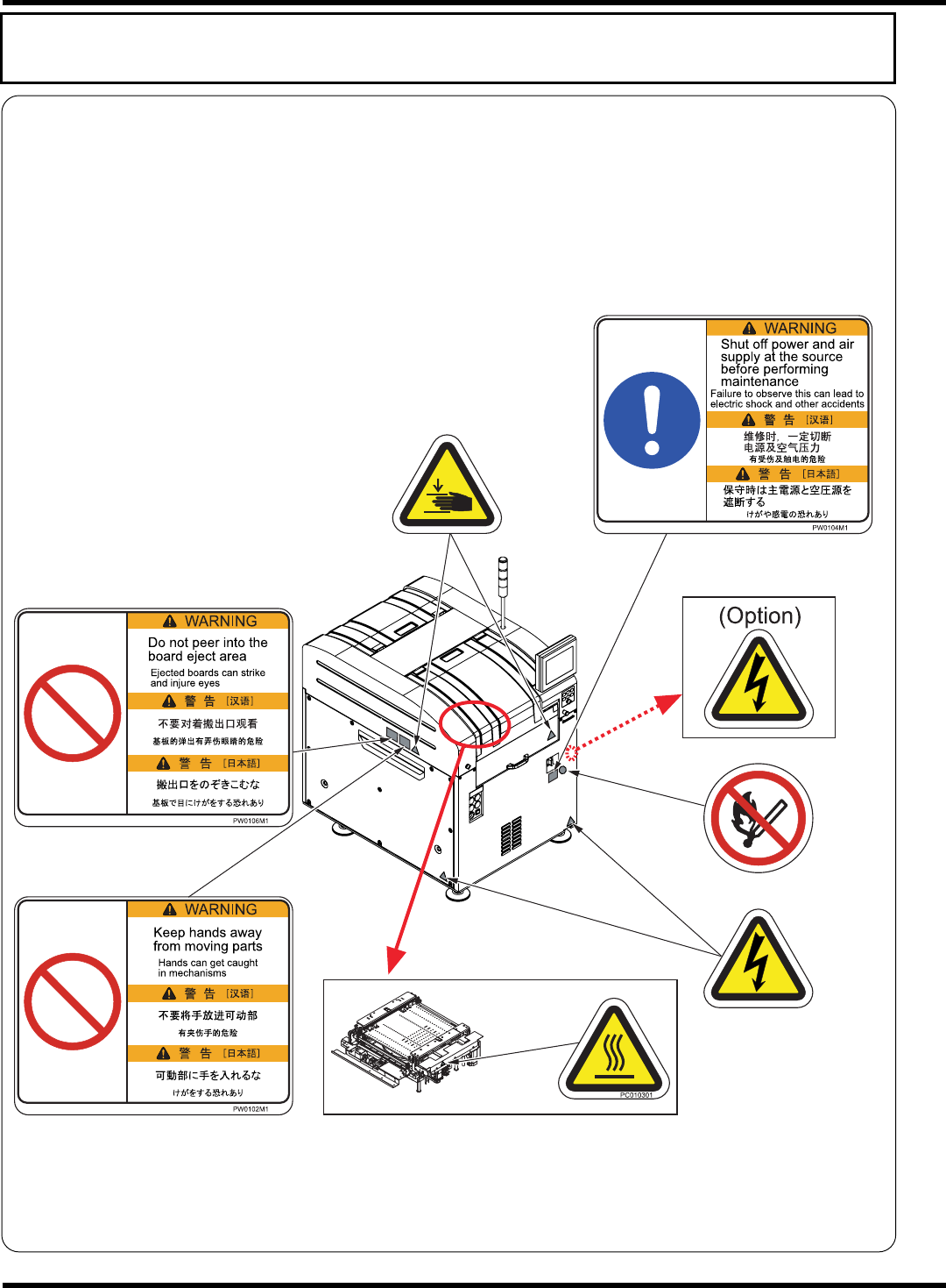 如下图所示,本机器贴有警告显示标牌。请遵守标牌的指示。