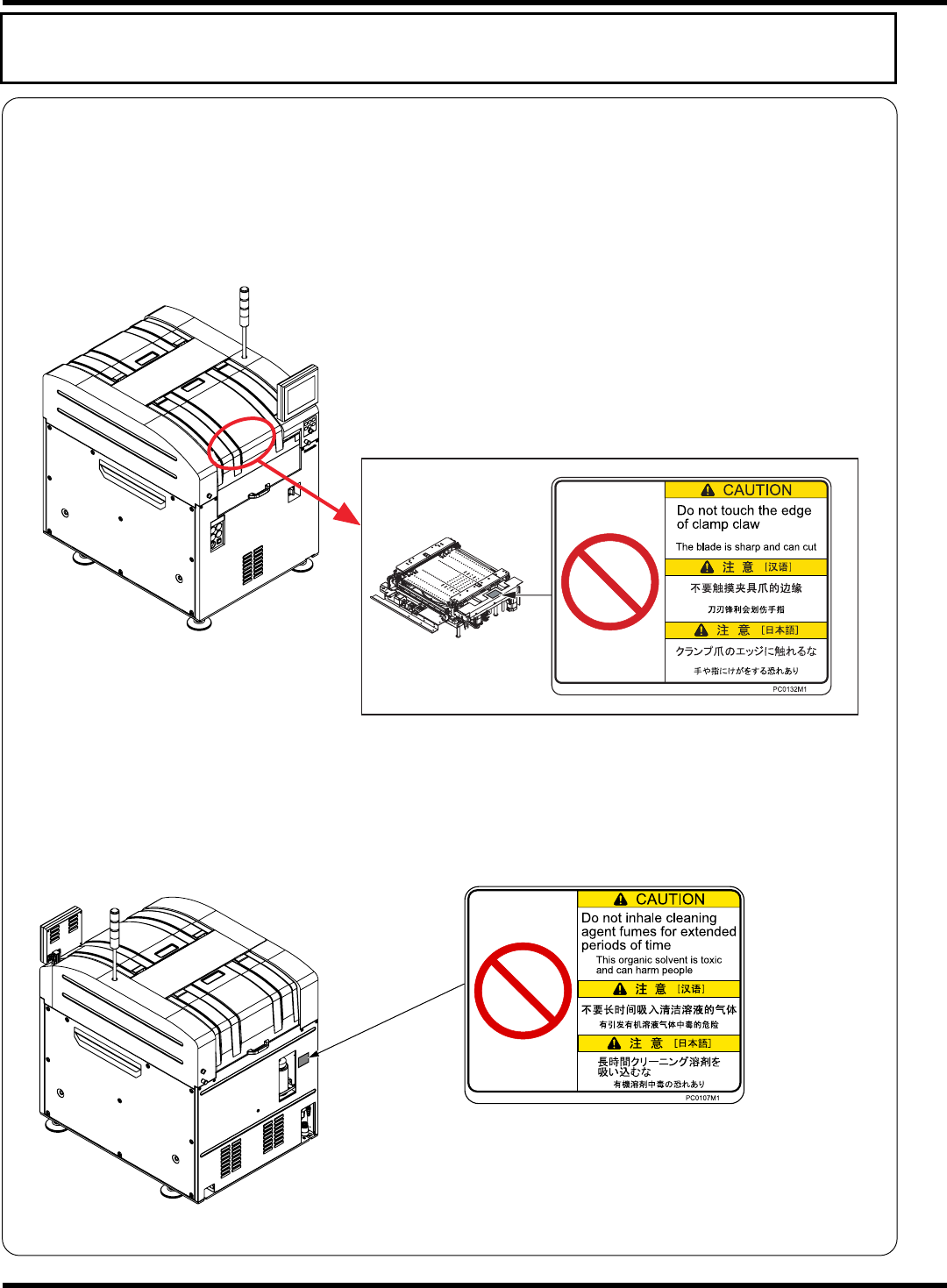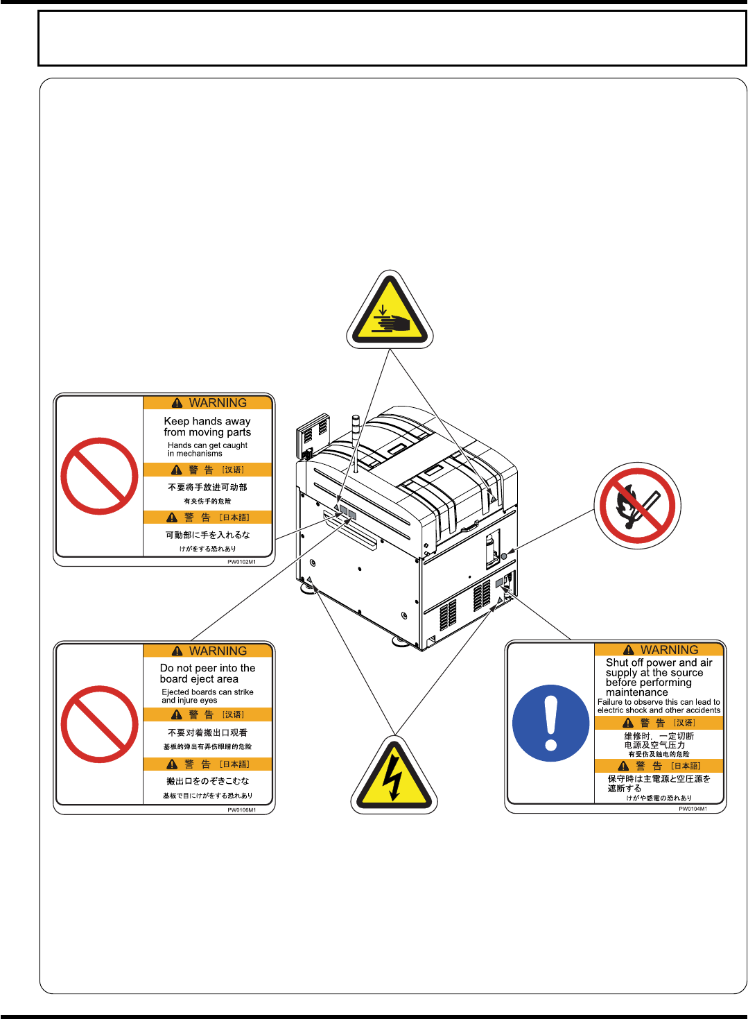 如下图所示,本机器贴有警告显示标牌。请遵守标牌的指示。