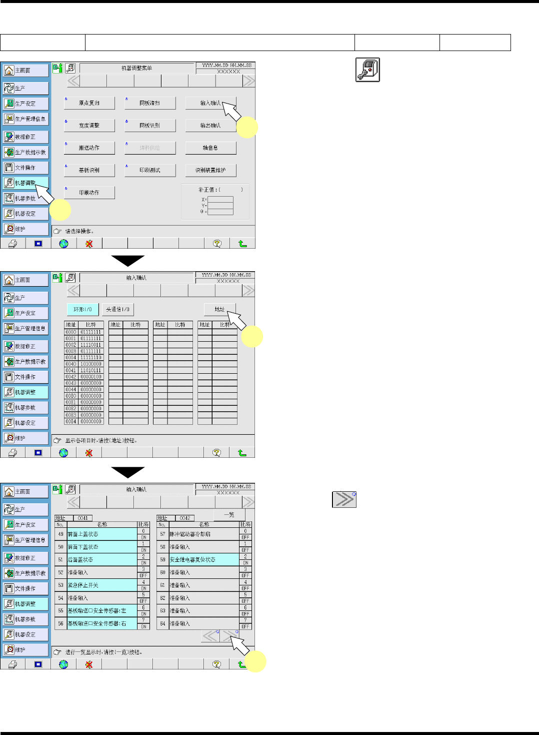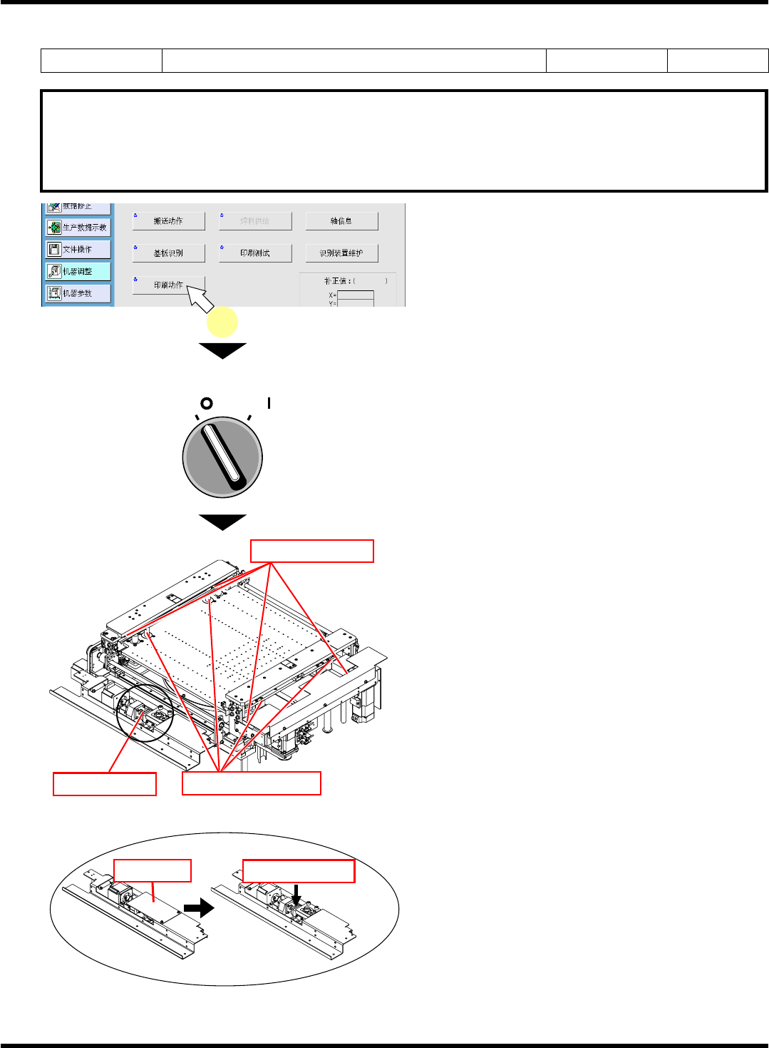 SP18P-L 维修手册 1.5 560 小时检查 (1 个月一次 ) Page 1-45 1.5.7 基板定位升降机的清扫和注油 使用工具 六角扳手 需要时间 2 分钟 要求 本维护是在电源开关置于 ON ( I ) 的状态下进行的作业。在可动部内进行作业时,请 务必将伺服开关置于 OFF ( O ) 后, 打开安全盖。 ( 安全盖打开, 可动部电机的电源将被 切断。 ) 1. 按机器调整菜单的 [ 印刷动作 ] 。 ∗ 请将升降机升…