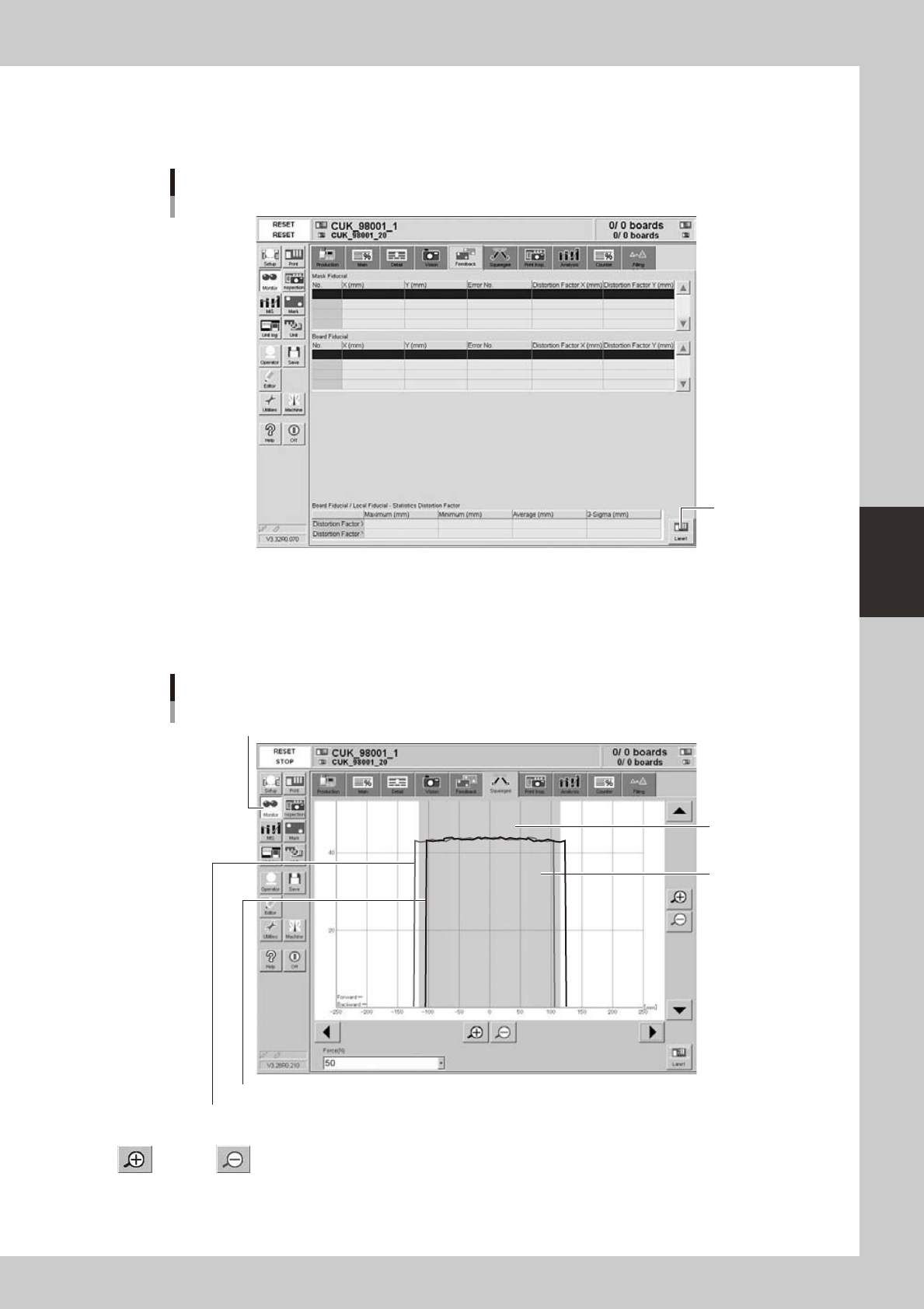 pressure (N). If the squeegee pressure varies abnormally, check the board clamping or surface condition.