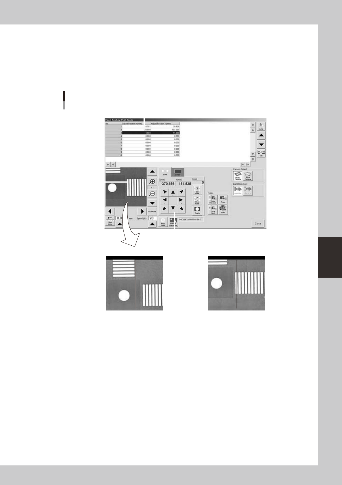 Pressing the [Trace Next] button displays an image of the alignment coordinates one row down.
