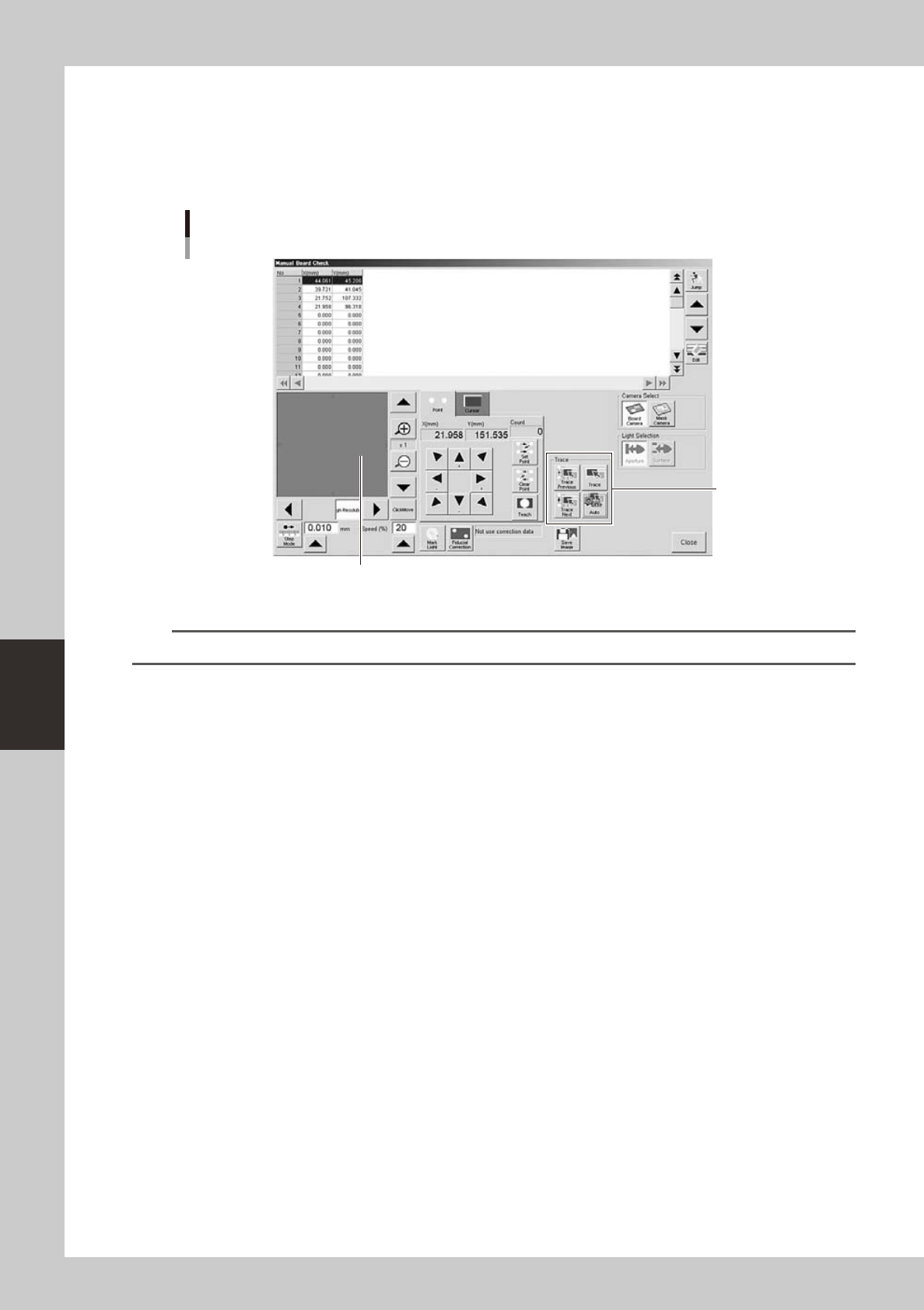 5-46 5 Creating and setting the data 2. On the manual board check screen, select the coordinate from which you want to start checks. 3. Press the [Trace] button to start vi sual checks. The printed state at the selected …