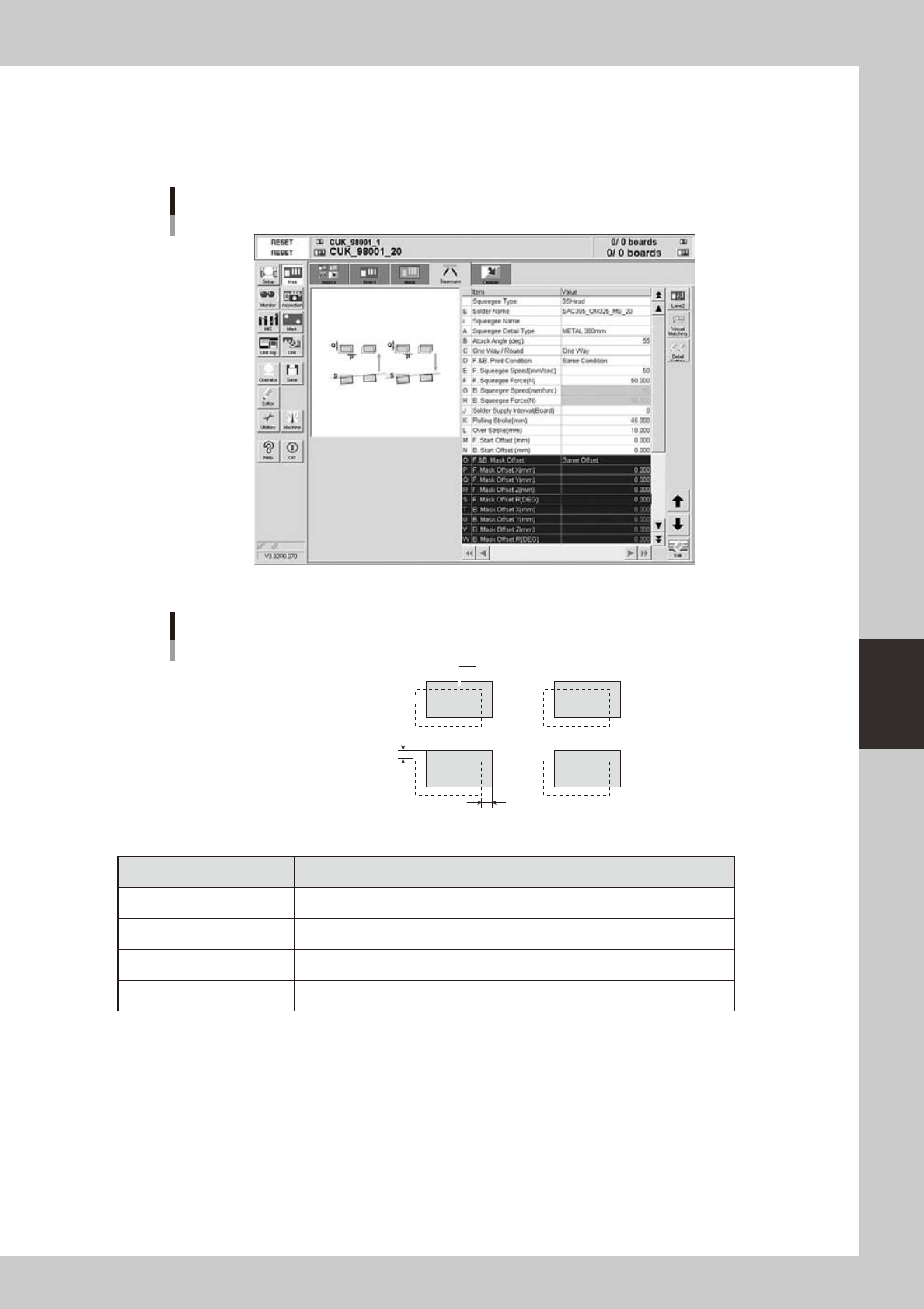Open the [Print]-[Squeegee] tab and adjust the following parameters.
