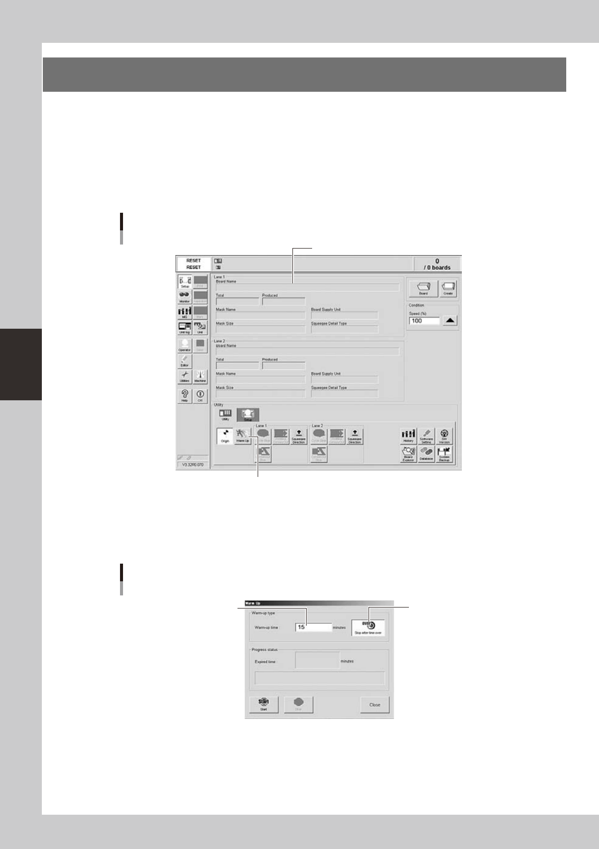 4-3 4 aily operation 4 Pr ess the [Start] button to start warm-up. The warm-up progress time and status will appear in the W ar m-up dialog box. W arm-up screen W arm-up elapsed time Pressing this button will stop the …