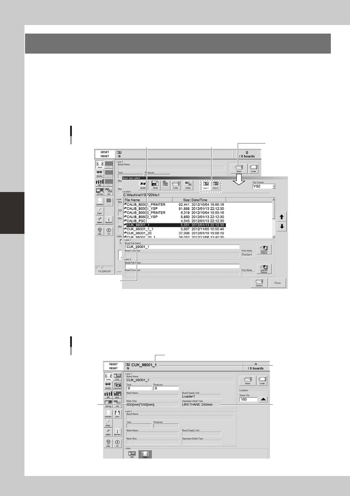 4-4 4 aily operation 3. Selecting the board data T o star t board production, first select the board data from the list of board data already created beforehand. 1 Select the board data. 1. When the board data is not y…