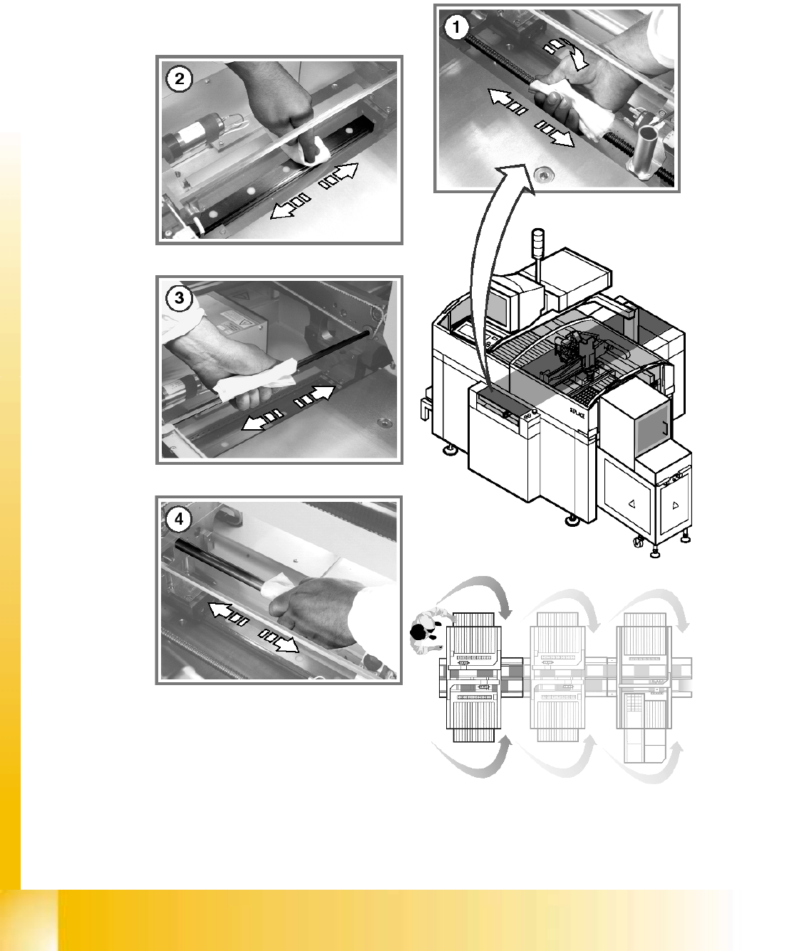 S 20 系列维修培训指南 I 2000 年 6 月版 7 预防性维修 45 维修元件供料台 维修元件供料台 维修元件供料台 维修元件供料台 K 清洁供料器 区域 O 用真空吸尘 器 除去 元件供 料台上的所有 松散 元件 O 用油 石除去 磁条 下 凹凸 不 平之 物 用无纺布 喷 上 WD40 后 对 供料器 区域进行 防 腐处 理 用真空吸尘器 除去 料带 容 器 中 的 松散 元件 如有必要 清 除 不 再 需要的 粘附标 签和…