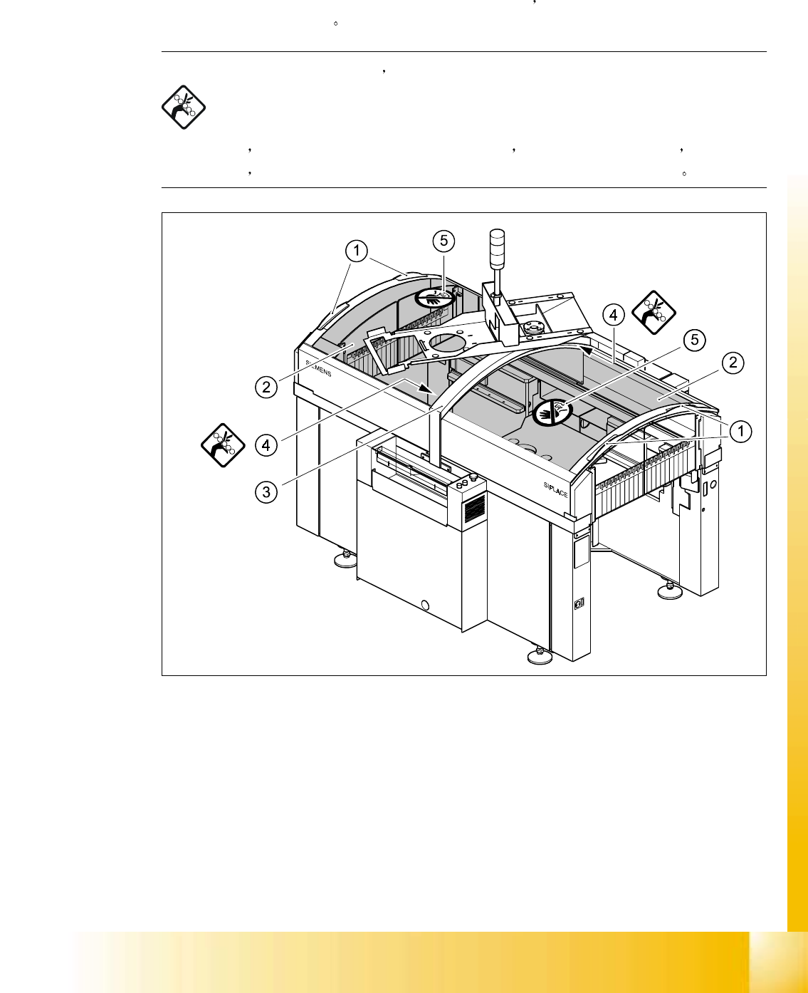 2000 年 6 月版 S 20 系列维修培训指南 I 1 安全注意事项 24 图 例 图 例 图 例 图 例 (1) 打开和 关 闭 保 护罩的 凹柄 (2) 保护罩 (3) 监视 器 横臂 (4) 监视 器 横臂 与 保护罩 之间 的 狭窄 缺口 ( 4 至 1 0 mm) (5) 不要将 手放在 这 个 平 面上 自动贴片机器的 每 个 保护罩 上都 有 两 个凹 柄 (1) 请注意 打开或关 闭 保护罩 时 务 必将 两 只手 …