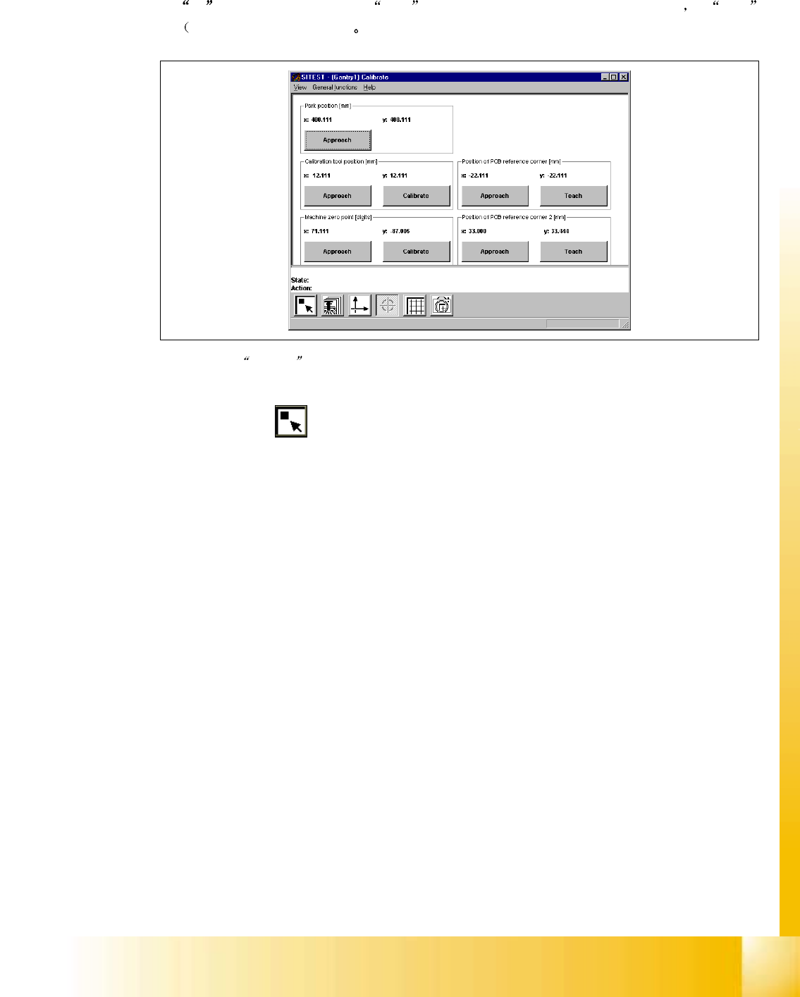 S 20 系列维修培训指南 I 2000 年 6 月版 8 校准 61 位置修 正 位置修 正 位置修 正 位置修 正 ! 教 教 教 教 按钮 (PCB 基准 角 2 位置 区 域 ), 用 ↑↓ ← → 箭 头 教 PCB 基准 角 的位置 用 终止 在设置框内 ) 接 受此位置 Fig. 8.7 - 27 校准位置 视图 ! => 回 到主视图
