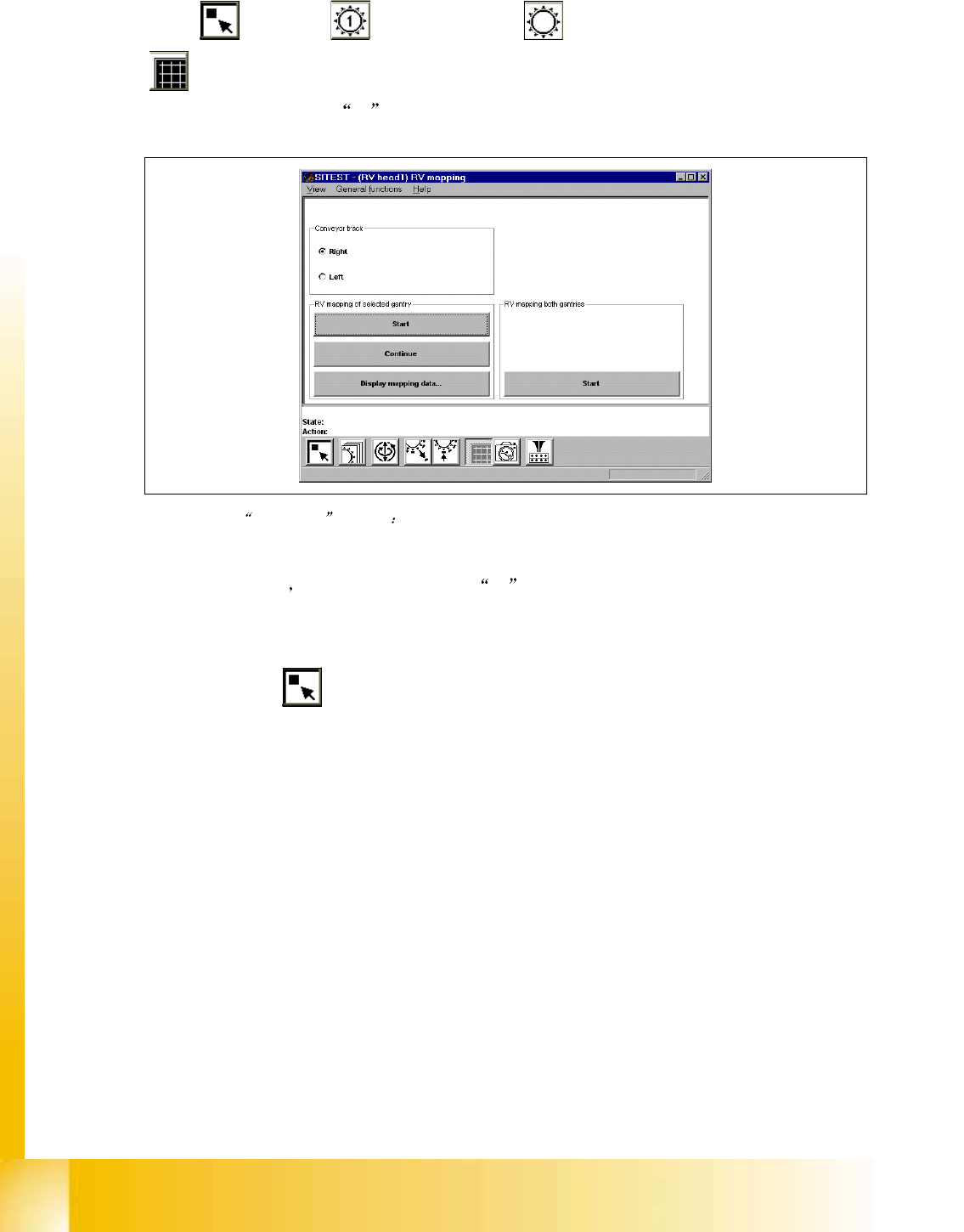 S 20 系列维修培训指南 I 2000 年 6 月版 8 校准 79 8.7.15.2 R V 映射 校准 映射 校准 映射 校准 映射 校准 2 个悬臂的 映射 校准 ( 只用于 2 个悬臂的 映射 校准 ( 只用于 2 个悬臂的 映射 校准 ( 只用于 2 个悬臂的 映射 校准 ( 只用于 SIPLACE S-23) Fig. 8.7 - 46 RV 头功能 视图 ! 主视图 => RV 头 2 => RV 映射 校准…