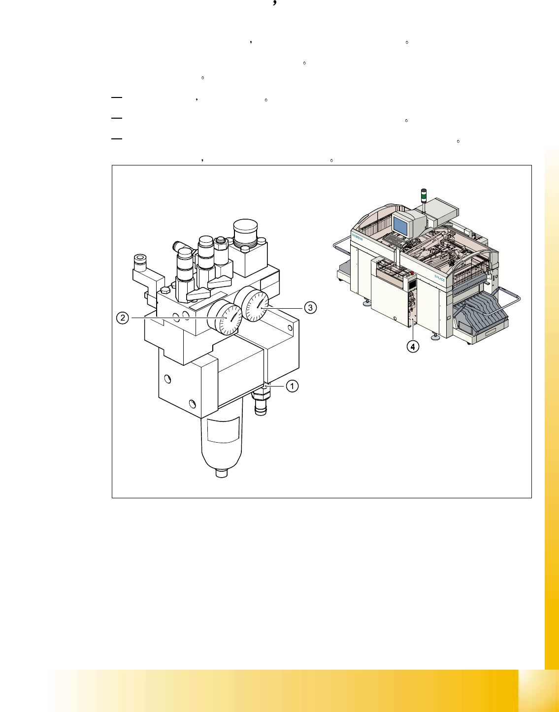 压缩空气单元的位置如 Fig. 1.1.12 中 4 所示 使用截止阀 (Fig. 1.1.12 中 1) 可以中断自动贴片系