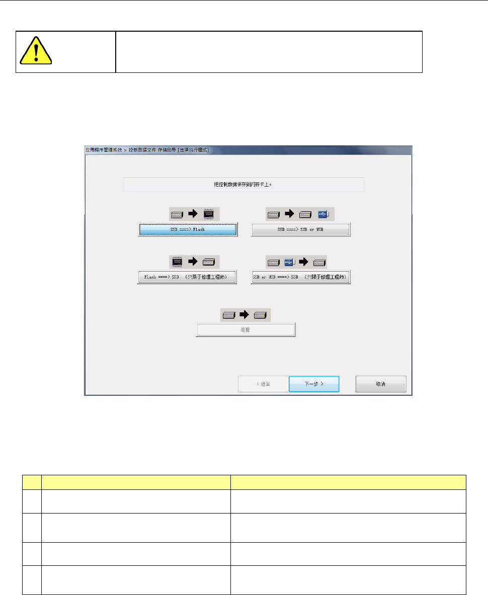第 2 部 功能 详解篇 第 13 章 程序 补充 13 - 10 13 -2- 1 将控制数据保存到闪存的处理 选择 1. [ SSD === > F las h ] (把控 制数据保存到主 机闪存上)后,显示 如下的画面。 确认要保存的内容后 ,请按 [ 下一步 >] 按钮。 如果要变更操作内容 等,请按 [< 返回 ] 按 钮。要结束作 业时请按 [ 取消 ] 按钮 。 按 [ 运行 ] 按钮来保 存控制数据。