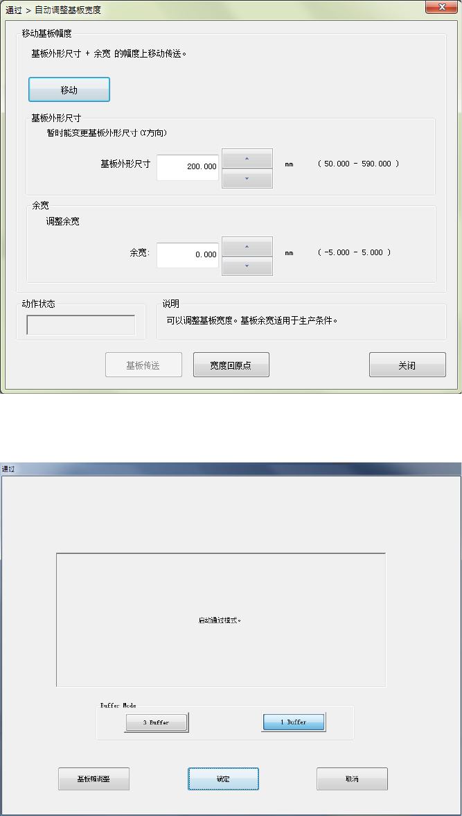 第 1 部 基本篇 第 2 章 生产 2- 18 选择 [ 是 ] ,显示「 自动调整基板宽 度画面」 。 按 [ 移动 ] 按钮调整 基板幅宽。 调整基板宽度后,或 在「基板宽度变更 询问提示信息 」中按下 [ 否 ] 后,显示以 下开始画面。 从 [3 缓冲 ] 和 [1 缓冲 ] 中选择任意的缓冲 模式,点击「 OK 」后将显示下一画面 。基板到达传送的 传感器上时传送带会 转动。 若选择 [ 调整基 板幅宽 ] ,则显示「 自动…