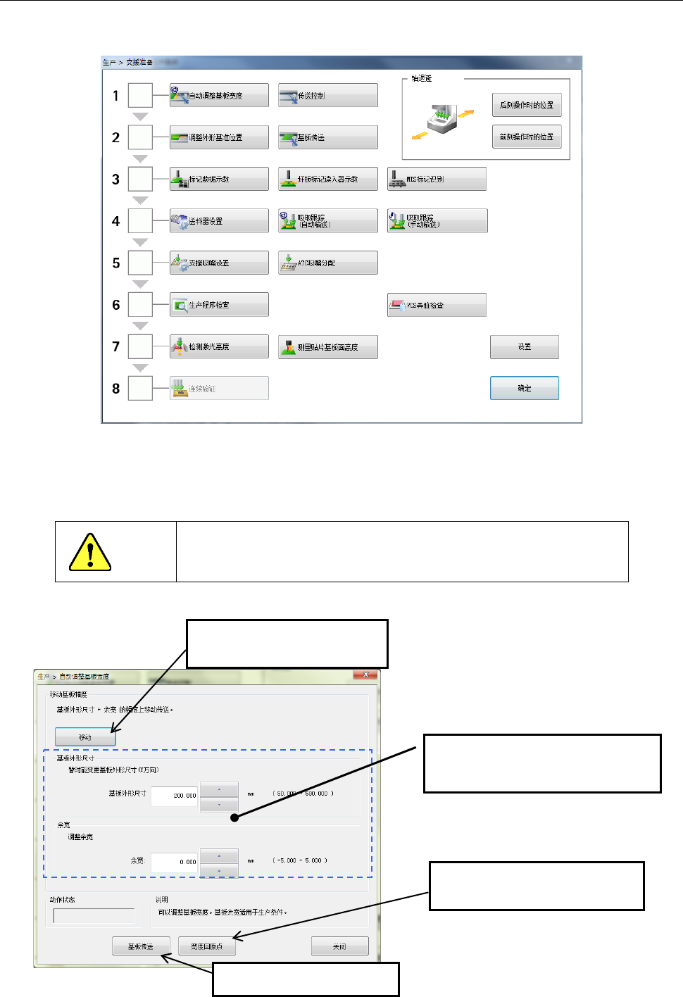 第 1 部 基本篇 第 2 章 生产 2- 25 2-7- 1 - 2 传送轨道宽度的调整 <在「自动调整基板 宽度画面」中的调 整方法> (1) 请从 生产的 菜单选择[生 产辅助]-[支援 准备] 。 (2) 请对准传送宽度 尺寸。 按下画面的 1 「自动调整 基板宽度」 ,即可显示「自 动调整基板宽 度」 画 面。 「自动基板宽度调整 」在单通道、双通 道下,有不同 的操作。 注意 按照以下说明点击 [ 移动 ] 按钮后, 传送即…