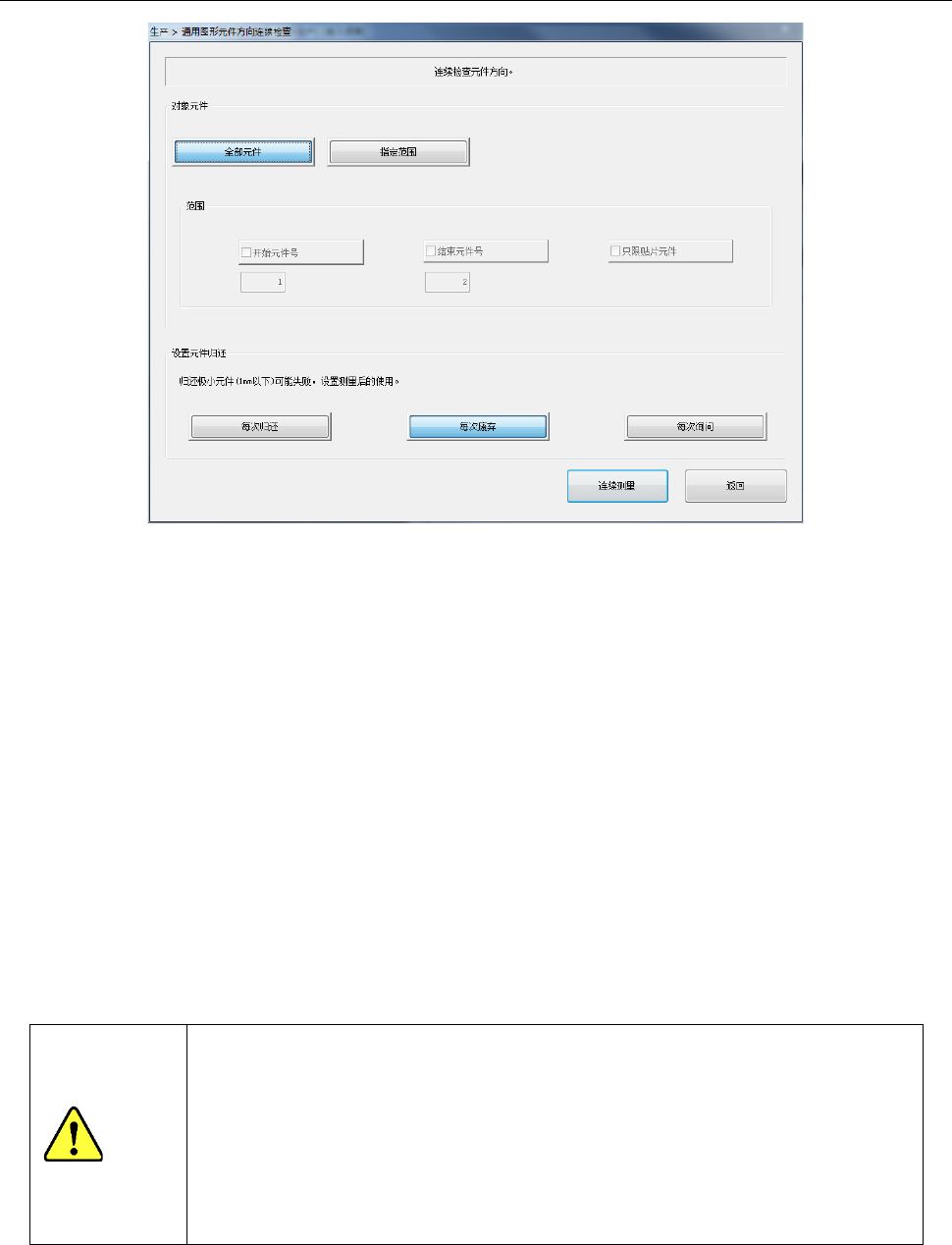 第 1 部 基本篇 第 2 章 生产 2- 125 2- 12 -4- 4 连续检查 (1) 对象元件 只检查元件数据中与 某种条件一致的元 件时,进行此 项设定。 1) 全部元件 从所有元件数据中检 查 SO T 的元件、或通用图像元件。 2 ) 指定范围 要对于对象元件的某 些元件编号进一步 检查时,请勾 选此项。 勾选后,可指定以下 内容。 ●开始元件号 指定开始检查的元件 数据的编号。 ●结束元件号 指定结束检查的元件 数据的编…