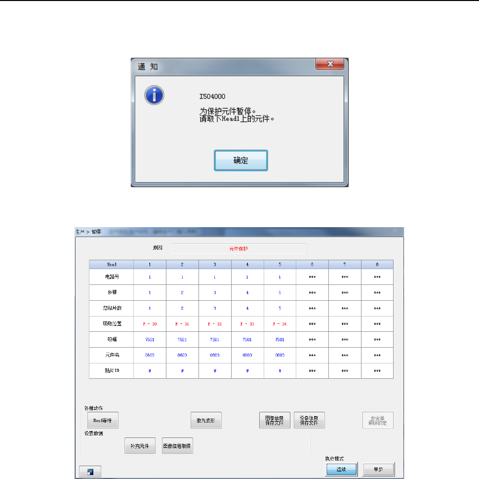 到元件保护位置后,显示通知画面,暂停生产。