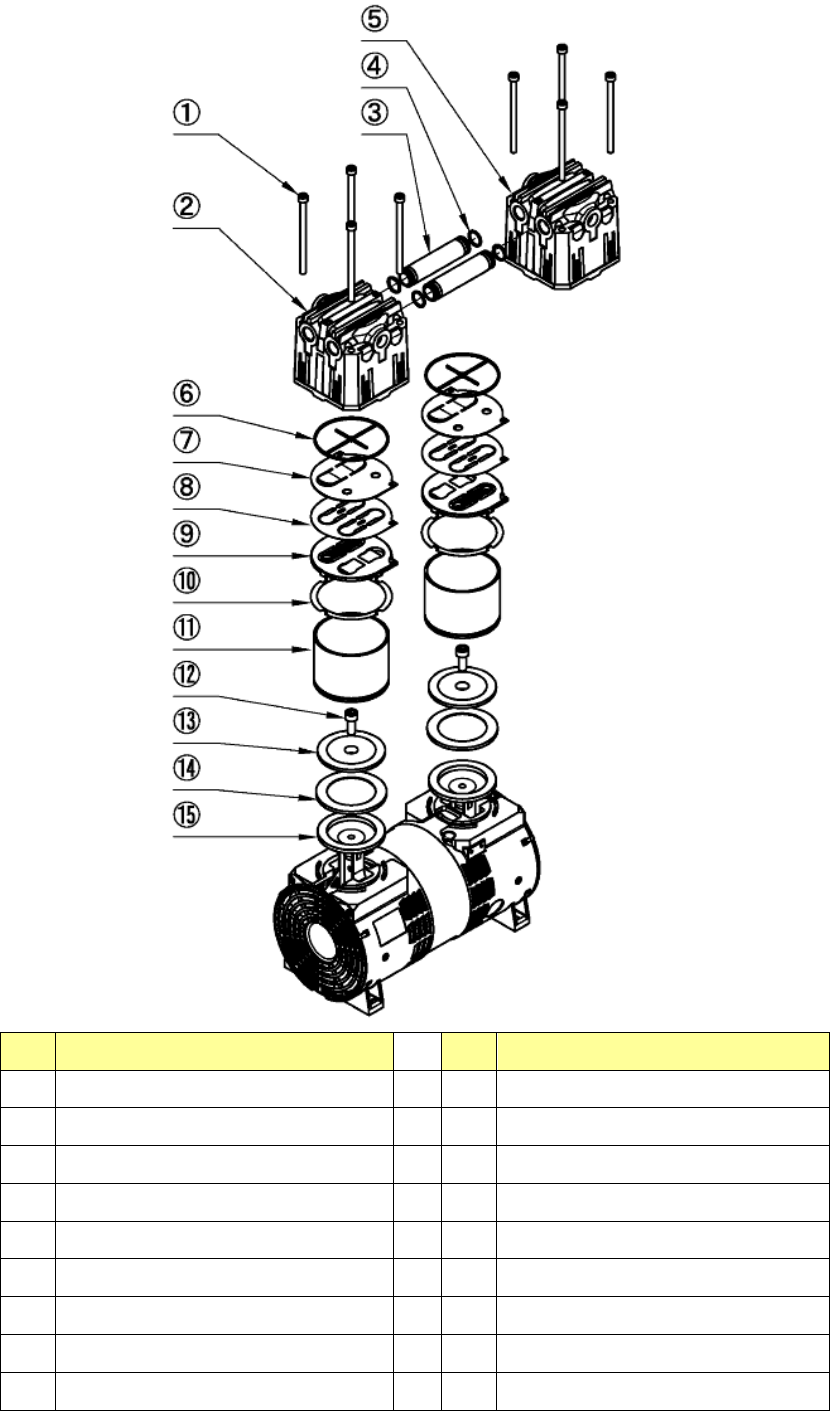 第 1 部 基本 篇 第 3 章 维护 3- 41 真空泵分解图 No. 名称 No. 名称 1 内六角螺栓( M6×95 ) 8 根 10 气缸密封圈 2 泵头盖 1 11 气缸 3 连接管 12 内六角螺栓 ( M 8×20 ) 4 O环 P- 10 13 碗型密封圈 压板 5 泵头盖 2 14 碗型密封圈 6 密封圈 15 连杆 7 阀挡板 8 吸排气阀 9 气缸板