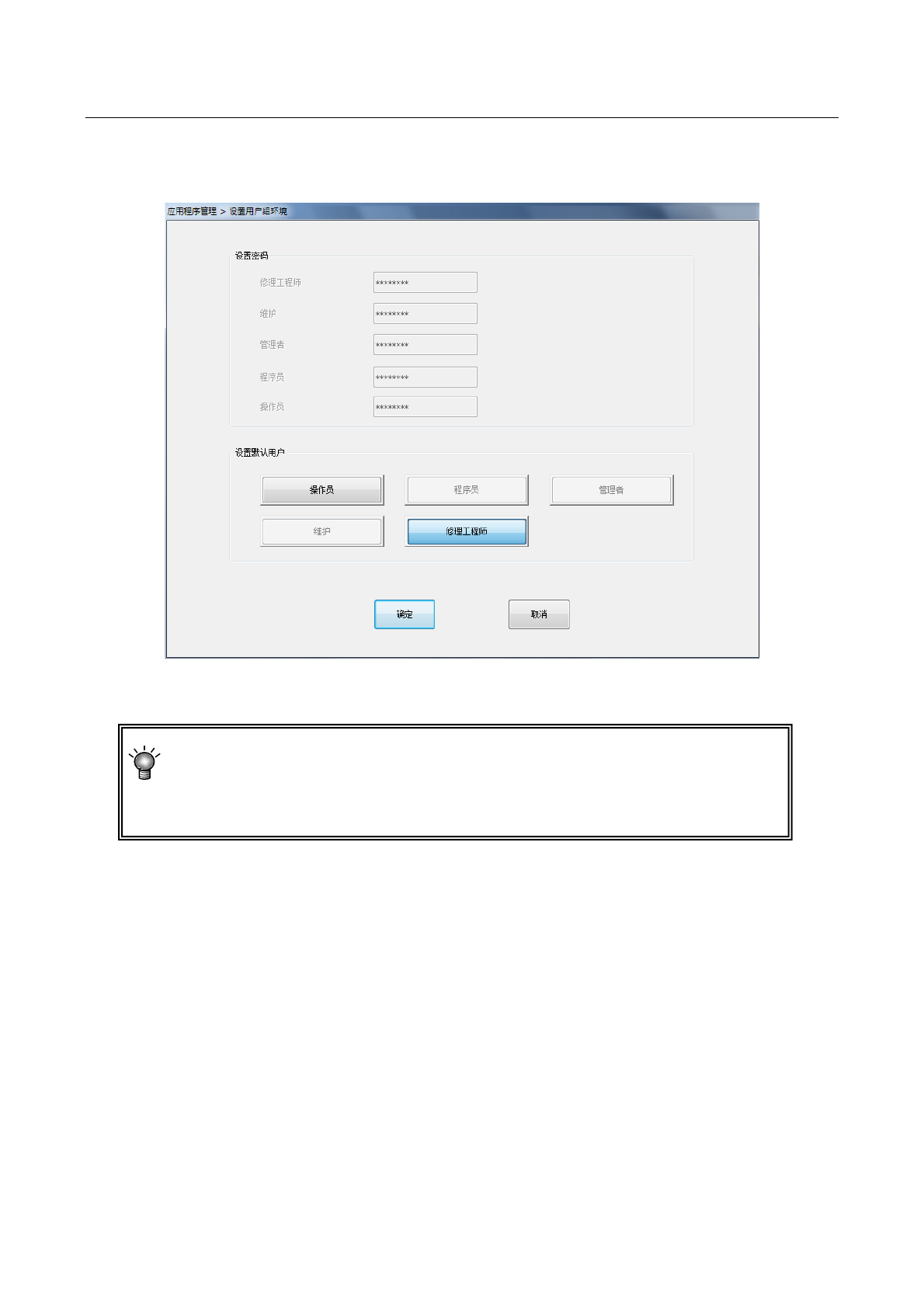 ●不能浏览或变更设置比当前级别更高的用户组密码。