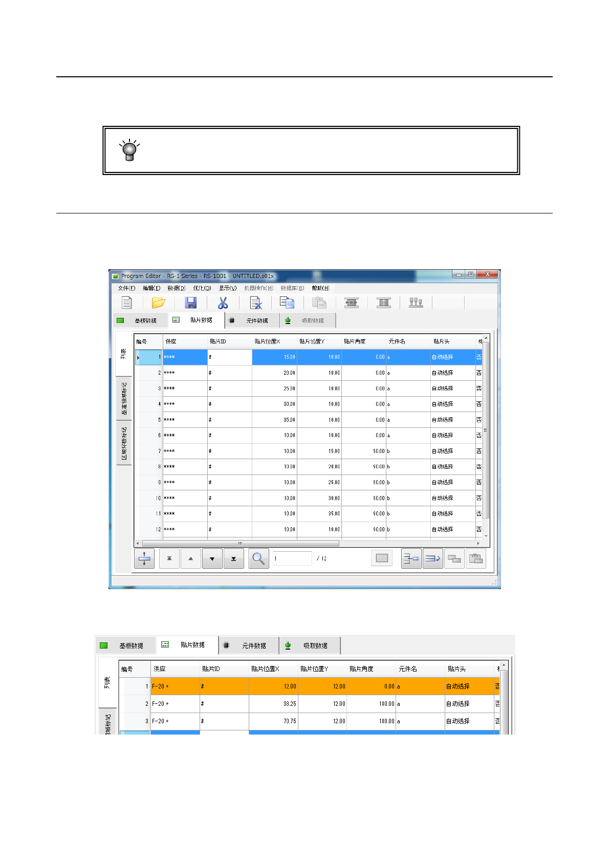 制作基板数据后,选择画面上方的「贴片数据」选项卡,可显示贴片数据制作画面(下图为制作完成的