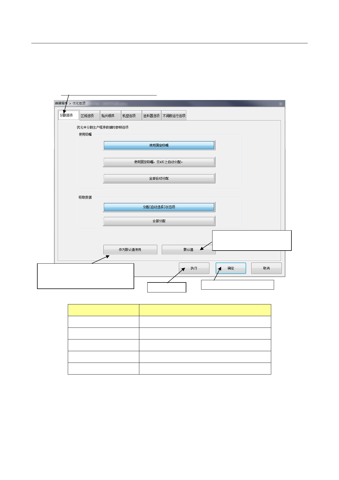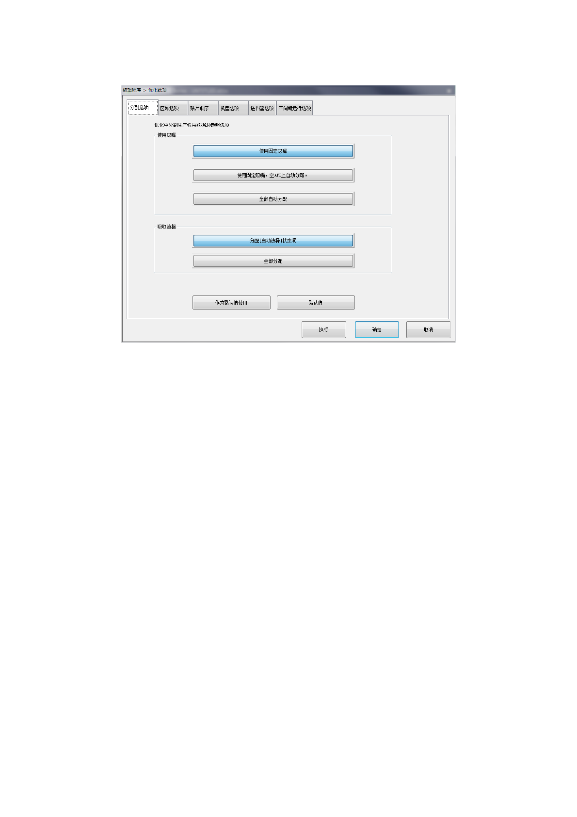 分割选项 设置分配吸嘴及吸取数据时的优化参照选项。
