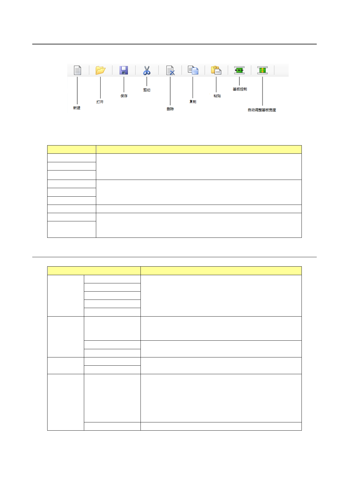 第 1 部 基本篇 第 4 章 制作生产 程序 4- 171 4-5- 2 工具 在编辑程序画面上部 显示的工具栏内容,如下所 示 。 各功能在不能使用的 画面中,按钮会显 示浅色。 项目 可否使用 新建 始终可 使用。 打开 保存 剪切 仅当编辑菜单的相同 命令可 使用 时,才能选择。 复制 粘贴 删除 在贴片数据列表画面 、基准领域标记 画面 、区域坏板 标记画面中可选择。 基板控制 始终可使用。 自动调整 基板 宽度 4-5- 2…