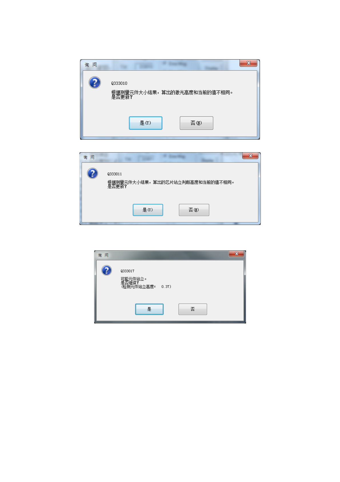 根据尺寸计算出的激光高度或芯片站立判定高度与原来的值不同时,显示如下询问提示信息。