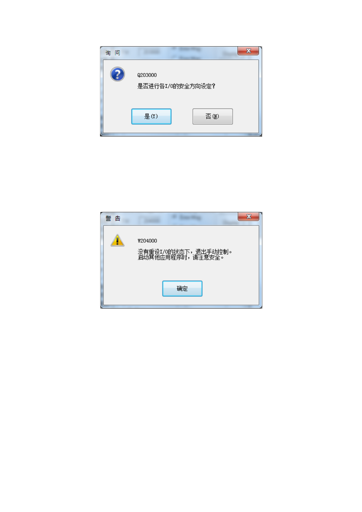 在各 I/O 安全方向设置确认提示信息中选择「否」时,会显示以下提示信息。
