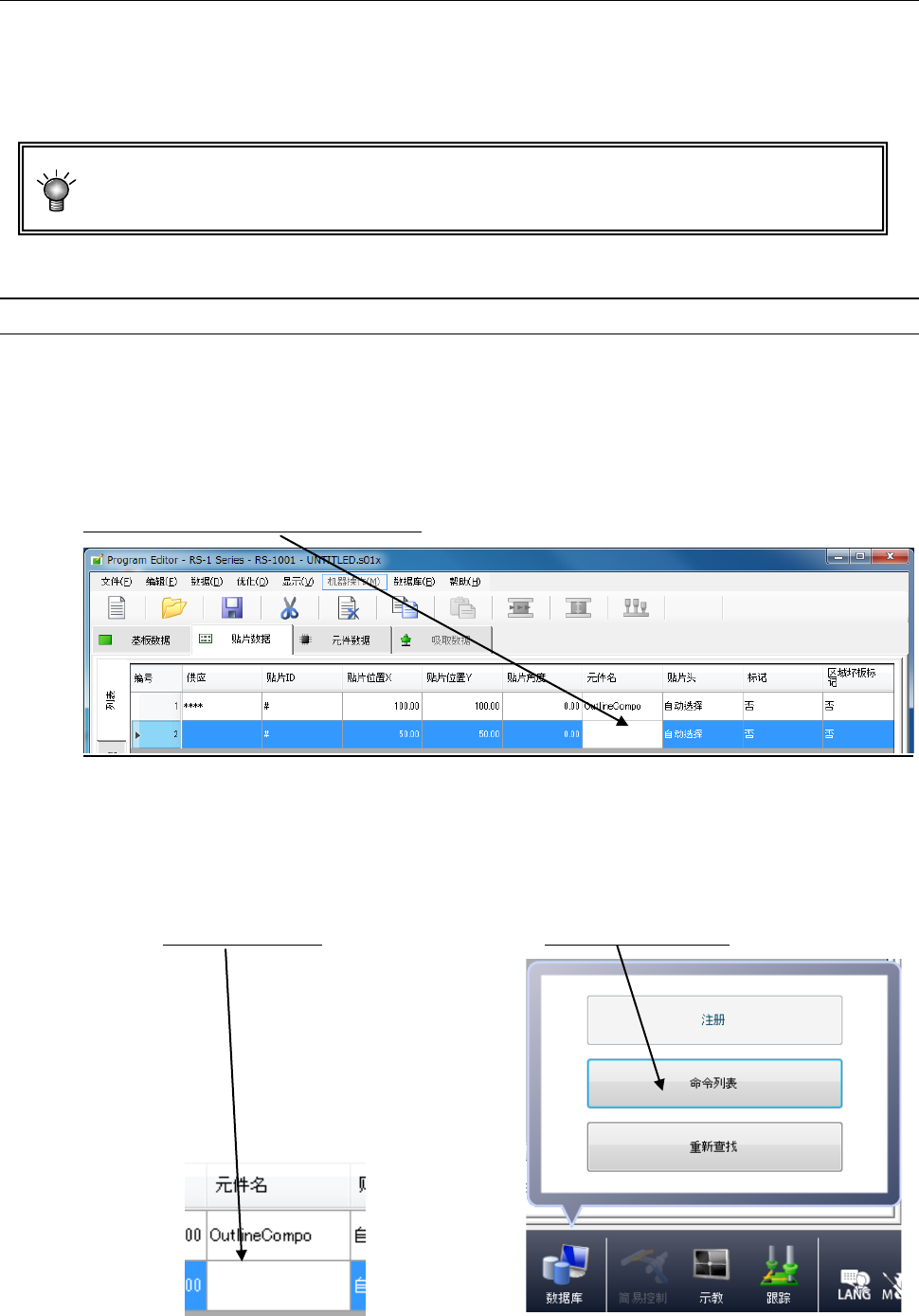 ① 请单击空白的元件名称栏。 ② 请单击「数据库」/「命令列表」。