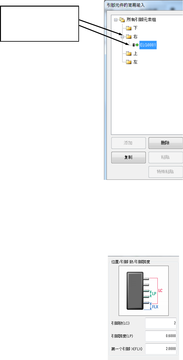 第 2 部 功能详 解篇 第 6 章 通 用图像元件 6- 23 (1) 引脚要素 组一 览 引脚要素组一览中, 可进行与 W indow s 浏 览器类似的操作。 (2) 引脚位置、引脚数量、引脚 跨度 ● 引脚数 (LC) :组内的引 脚数 ● 引脚跨度 (LP) :从引脚中 心到下一引脚中心 的距离 ● 第一个引脚 X(FLX) :从角 ( 最外围 ) 到首元件要素 的距离 单击 [ + ] , 则符号 会 变为 [ - ] , …