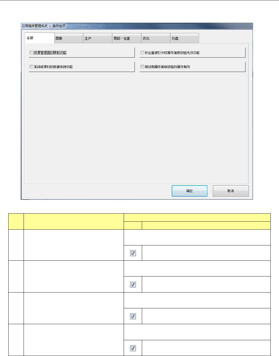 第 2 部 功能详 解篇 第 7 章 操作 选项 7-4 7- 2 全部 设置对应的全部 (统管 整体的 )操作选项。 No 项目 内容 状态 动作及详细内容 1 资源管理器的限制功 能 设置通过用户级别限 制使用 W indow s 资源管理器的 功 能。 通过用户级别限制使 用 W indow s 资源管理器。 2 安全盖被打开时操 作面板按钮无效功 能 设置打开安全盖 (罩) 时除操作面板 的 S TO P 开关以外 所有开关无效…