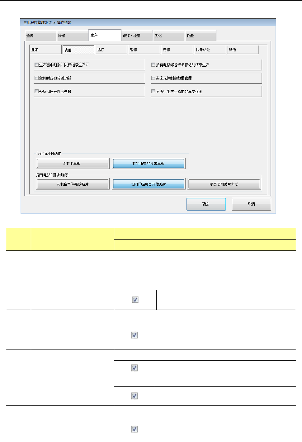 第 2 部 功能详 解篇 第 7 章 操作 选项 7- 12 7-4- 2 功能 按下[功能]按钮后 ,会显示 “ 生产 功能选项设置画面 ” 。 序号 项目 内容 动作及详细内容 1 生产被中断后, 执行继续生 产。 对因用户要求中断生 产(按 下暂停键 中断)时是 否显示 「继续 生产」提示进行设置 。 生产非 正常 结束时(发 生异步现象 、生 产非正常结 束) ,将 无 条件地生成继续生产 文件。 生产中断时生成继续 生产文件。…