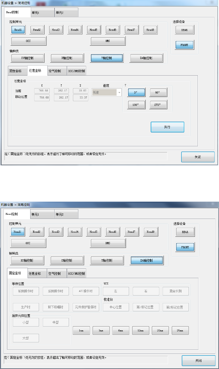 选择轴种类 [XY 轴控制]、[Z 轴控制],选择「执行」后,即可把轴移至[任意坐标]的移动坐标位