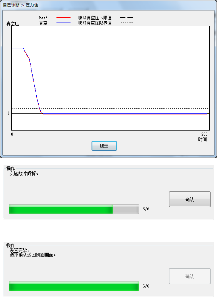 第 2 部 功能 详解篇 第 11 章 自己 诊 断功 能 11 - 20 设定 H ead 移动到真空校准上面 ,计测加压破坏状 况 3 次。 ・ 显示第 2 次和第 3 次的平均值。 ・ 计测后显示的压力 值图表,是第 3 次的 数据。 ・ 请按下[确认]。