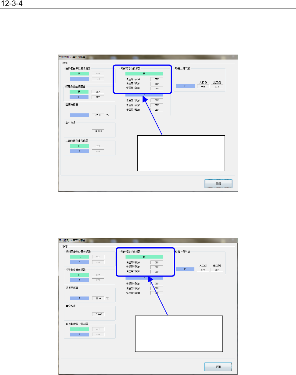 请向手动控制>其他>其它传感器 转移,使用 RF08AS 进行以下作业,以检查后侧传送带浮起传感