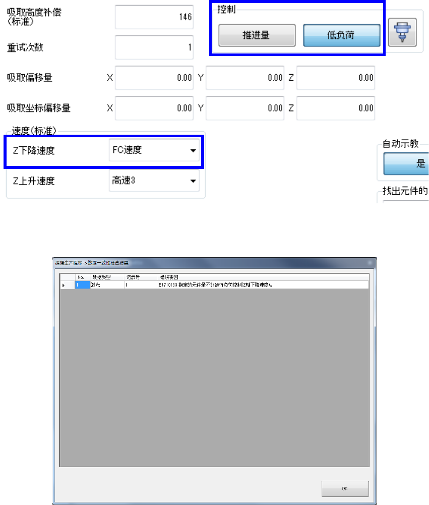 Z 轴下降速度不是 FC 速度,推进量为负荷输入(g)时,一致性检查时会发生错误。