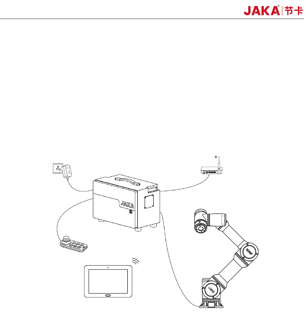 如图 2-1 所示,JAKA Zu 和 C 系列机器人使用无线互联的方式,使用时需要包括以下几个部件: