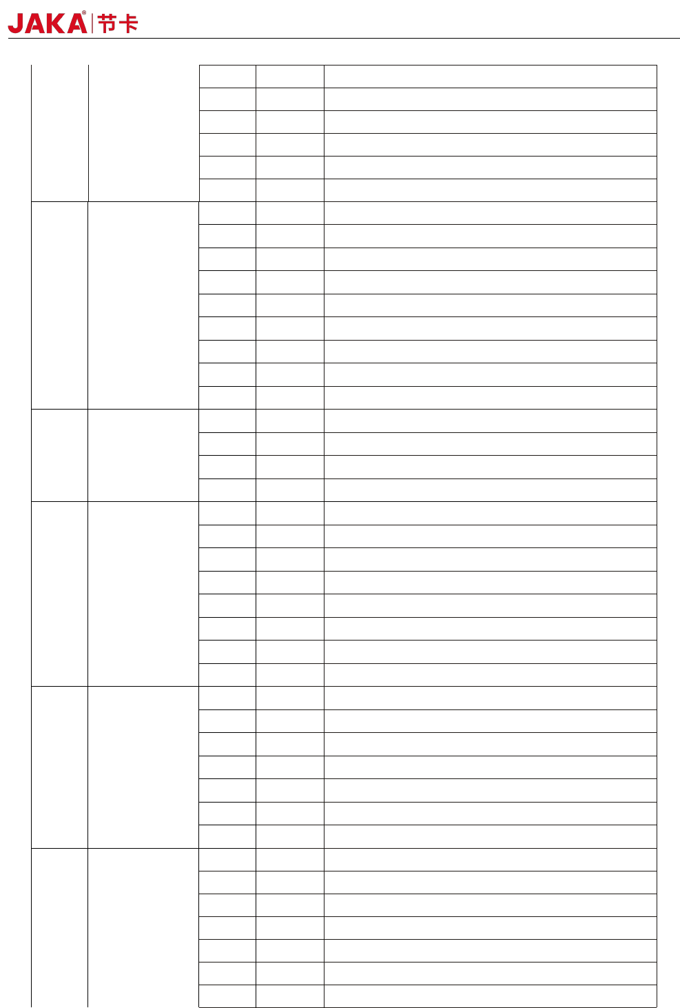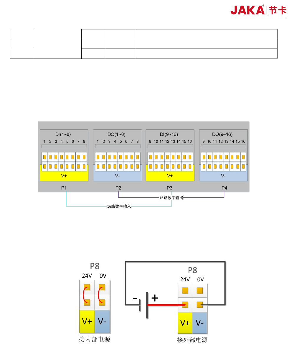 JAKA Zu 7 v2.5 和 JAKA C 7 21 4 DI12 第 12 路数字输入, PNP 型,高电平 有效 5 DI13 第 13 路数字输入, PNP 型,高电平 有效 6 DI14 第 14 路数字输入, PNP 型,高电平 有效 7 DI15 第 15 路数字输入, PNP 型,高电平 有效 8 DI16 第 16 路数字输入, PNP 型,高电平 有效 9~16 V+ 隔离电源输 入正,默认短 接片接内部 24V …