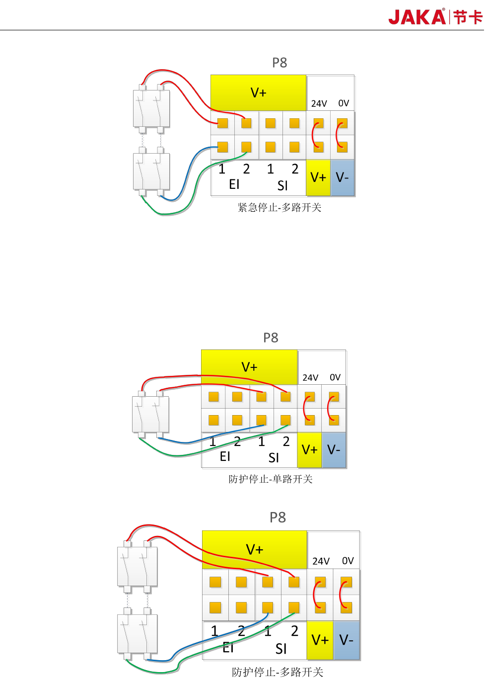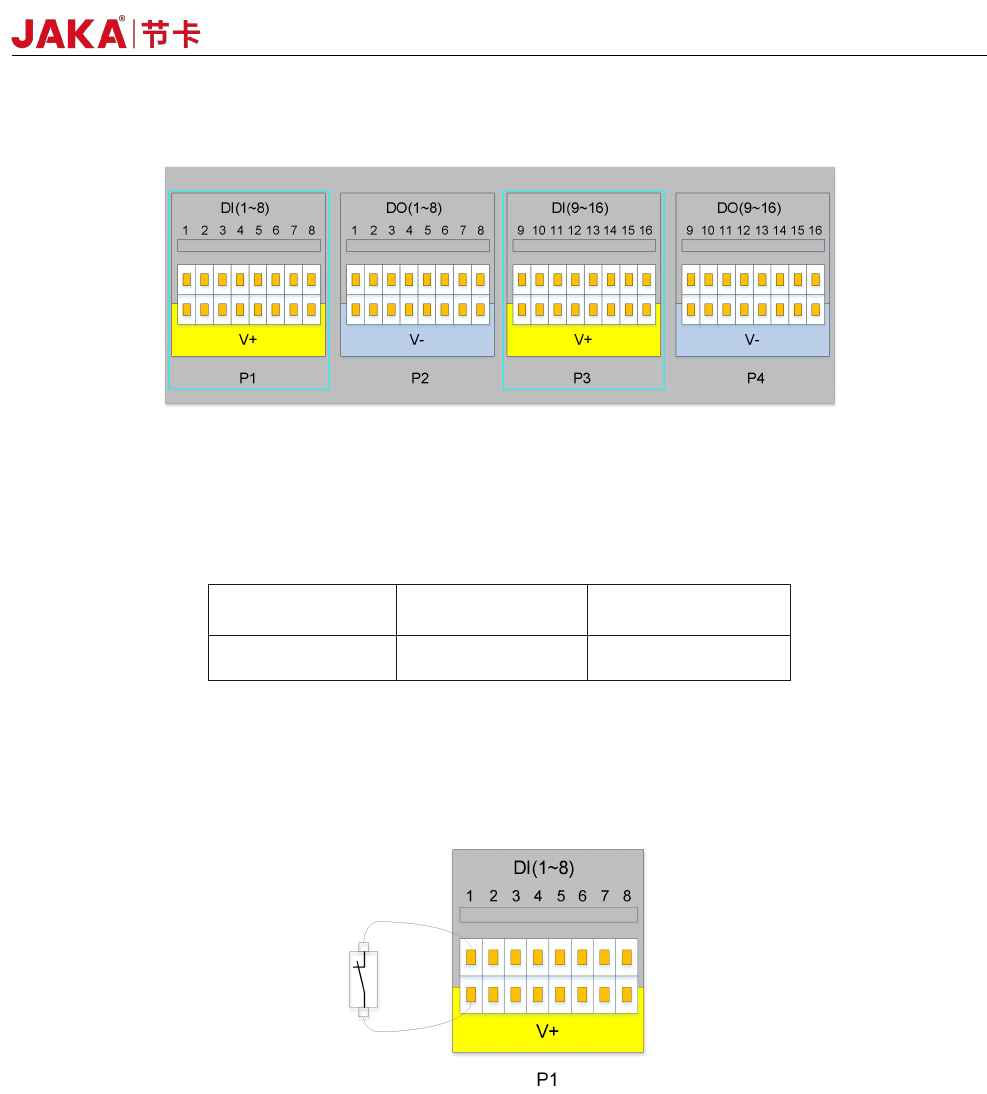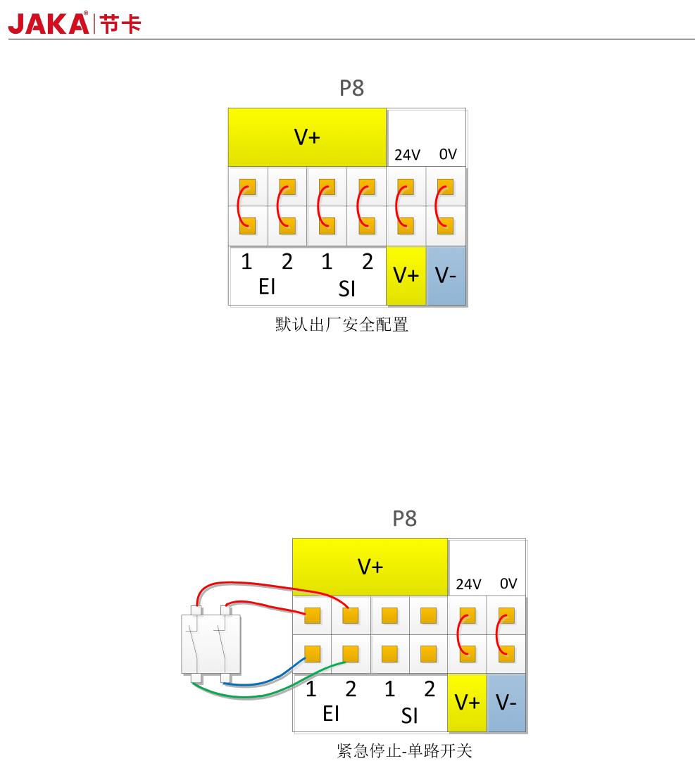 24 JAKA Zu 7 v2.5 和 JAKA C 7 图 4-6 3 、连接 防护停止开关 防护停止功 能, 支持自动恢复 。 门开关就是防护停 止设备的一个 应用案例,门打开时, 机器 人停止。接线图 如下图 4-7 : 图 4-7