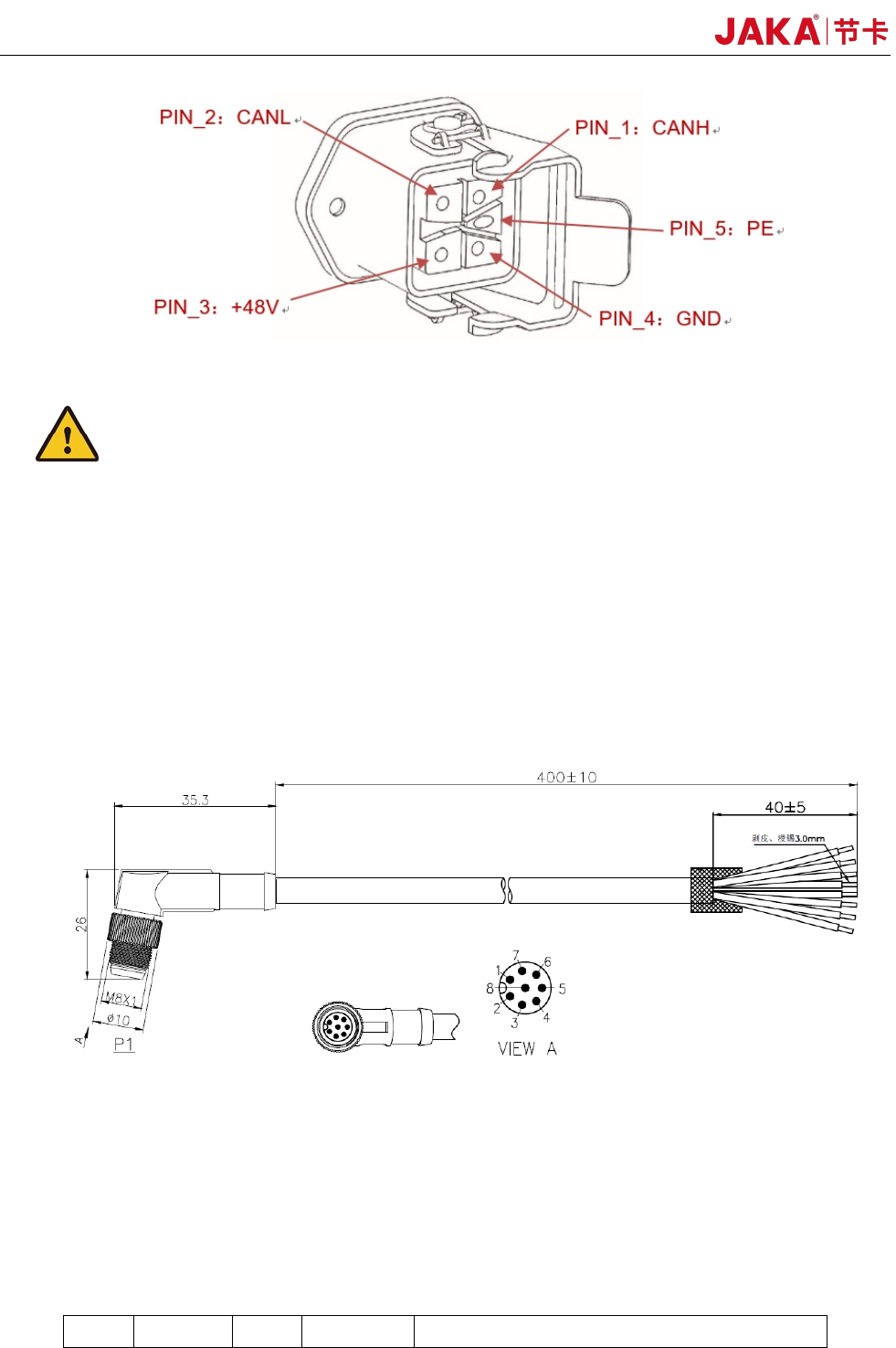 JAKA Zu 7 v2.5 和 JAKA C 7 29 图 4-15 电控柜底面板示 意图 4.4.1 电源连 接 机器人电源 连接线随机器 人提供, 电源 线一端为品字 插头插在电控 柜底面板的品 字插座上, 另一 端为三角插 头, 根据 安全评估规范, 插到相应的 市电插座上 。 品字插座带 有开关和保险 丝。 开关仅限于在机器 人关机状态下 使用, 以将 机器人电源彻 底断开。 开关内配备 的保险丝型号, 请根据机器 人工作工况…