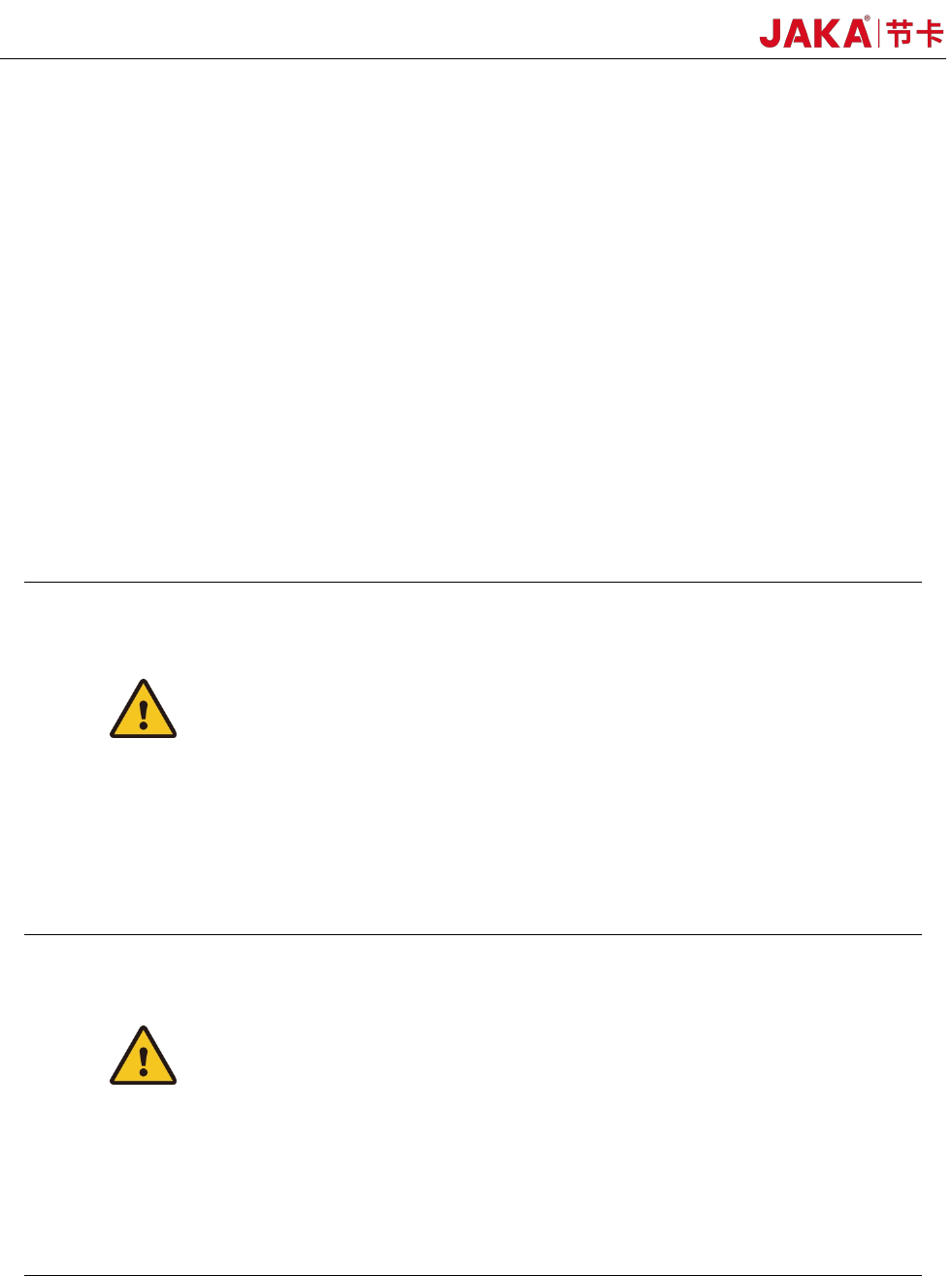 34 JAKA Zu 7 v2.5 和 JAKA C 7 第 5 章 维护 和维修 维护和维修 工作务必严格 遵守本手册的 所有安全指示 。 维修必须由 节卡授权 的系统集成商 或节卡的工作 人员进行。 零件退回给 节卡时应按服 务手册的规定 进行操作。 5.1 安全指示 维护维修后 , 必须进行核 对以确保服务 要求的安全级 别。 核对 时必须遵守有 效的国家或地 方性安全法律 法规。 同时应检测 所有安全功能 是否都正常。 维护维修…