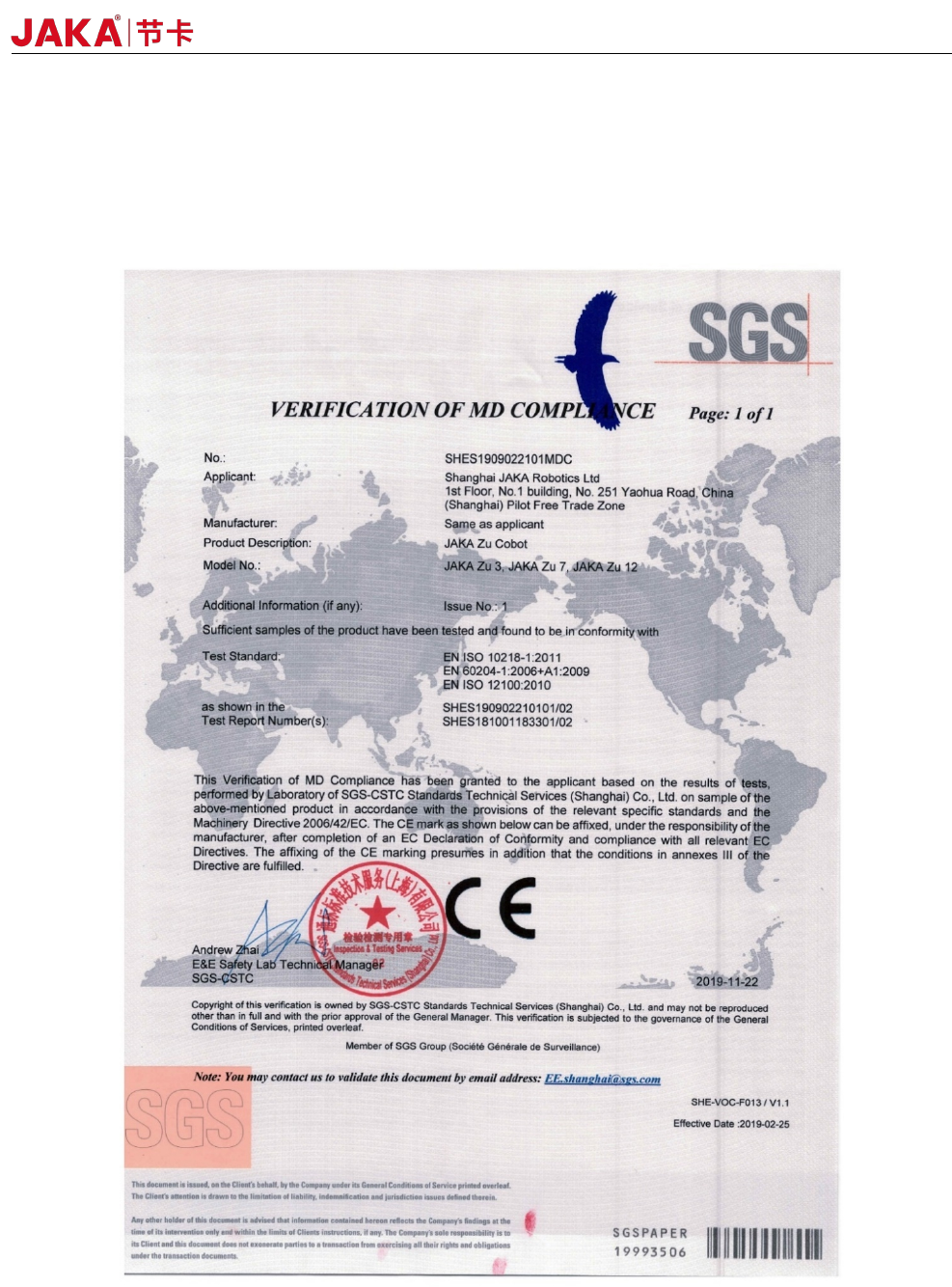 本公司产品 JAKA Zu 7 和 C 7 机器人,通过欧盟 RoHS 2.0(2011/65/EU)及修订指令(EU)2015/863,符合欧