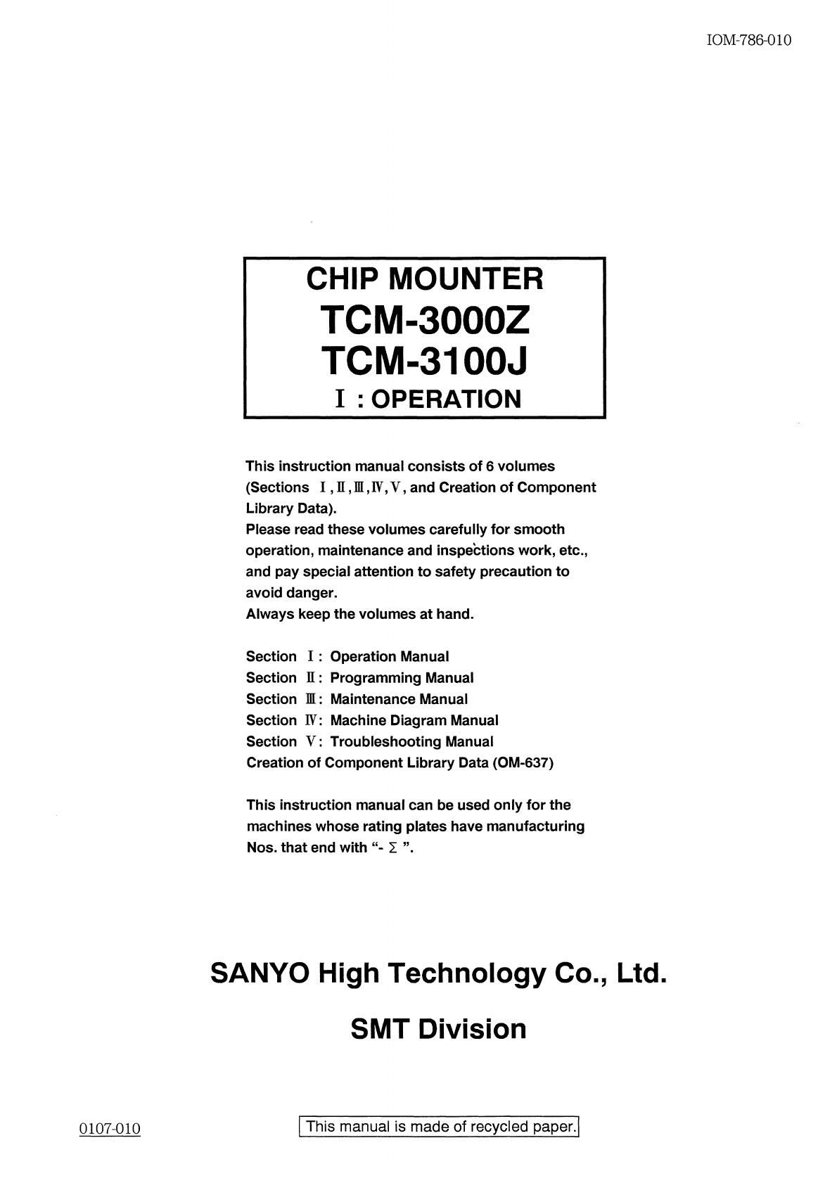 IOM - 786 - 010 CHIP MOUNTER TCM - 3000 Z TCM - 3100 J I : OPERATION This instruction manual consists of 6 volumes ( Sections I , n , M , IV , V , and Creation of Component Library Data ) . Please read these volumes care…